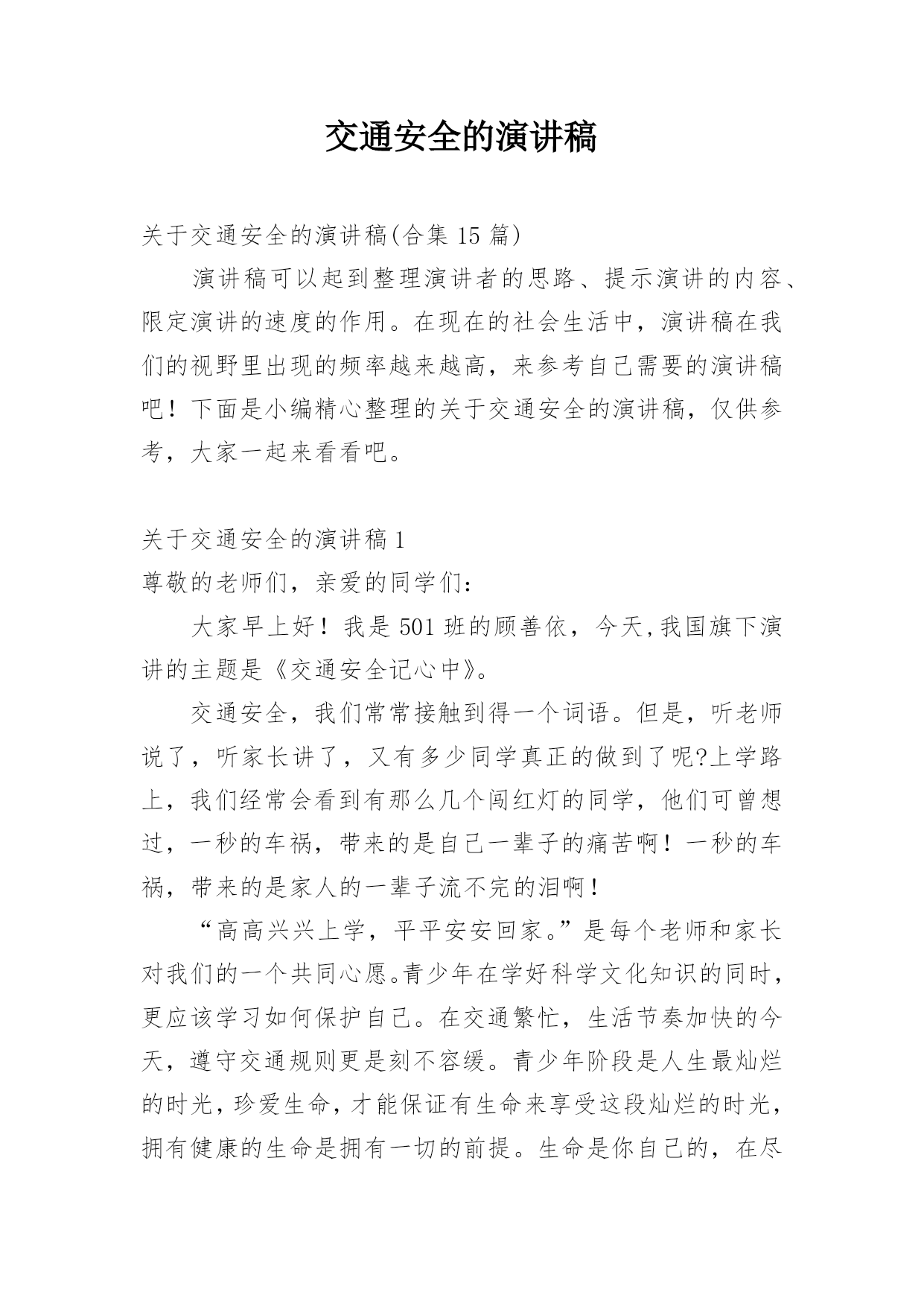 交通安全的演讲稿关于交通安全的演讲稿(合集15篇)演讲稿可以起到整理演讲者的思路、提示演讲的内容、限定演讲的速度的作用。在现在的社会生活中,演讲稿在我们的视野里出现的频率越来越高,来参考自己需要的演讲稿吧!下面是小编精心整理的关于交通安全的演讲稿,仅供参考,大家一起来看看吧。关于交通安全的演讲稿1尊敬的老师们,亲爱的同学们:大家早上好!我是501班的顾善依,今天,我国旗下演讲的主题是《交通安全记心中》。交通安全,我们常常接触到得一个词语。但是,听老师说了,听家长讲了,又有多少同学真正的做到了呢?上学路上,