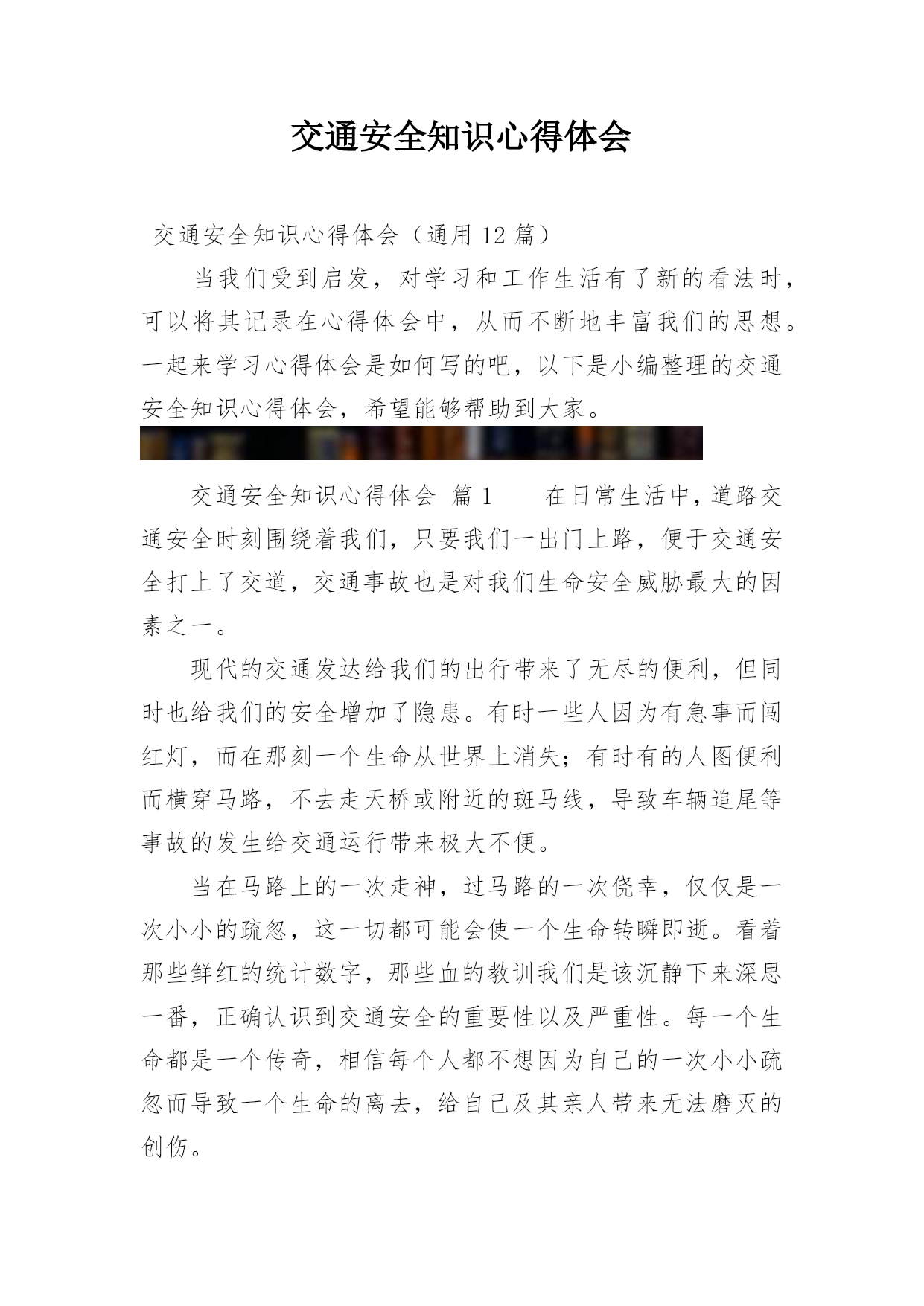 交通安全知识心得体会交通安全知识心得体会(通用12篇)当我们受到启发,对学习和工作生活有了新的看法时,可以将其记录在心得体会中,从而不断地丰富我们的思想。一起来学习心得体会是如何写的吧,以下是小编整理的交通安全知识心得体会,希望能够帮助到大家。交通安全知识心得体会篇1在日常生活中,道路交通安全时刻围绕着我们,只要我们一出门上路,便于交通安全打上了交道,交通事故也是对我们生命安全威胁最大的因素之一。现代的交通发达给我们的出行带来了无尽的便利,但同时也给我们的安全增加了隐患。有时一些人因为有急事而闯红灯,而在
