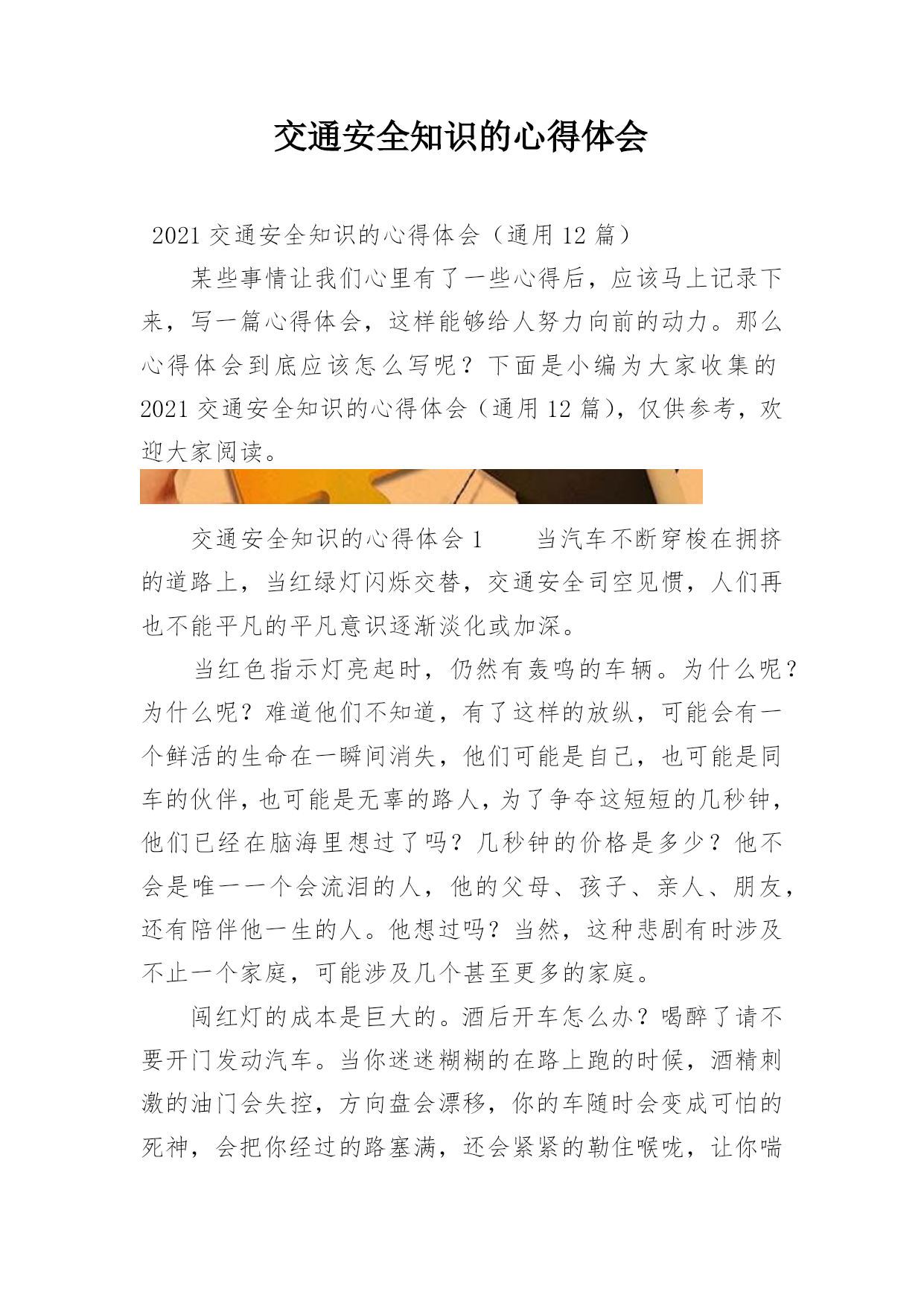 交通安全知识的心得体会2021交通安全知识的心得体会(通用12篇)某些事情让我们心里有了一些心得后,应该马上记录下来,写一篇心得体会,这样能够给人努力向前的动力。那么心得体会到底应该怎么写呢?下面是小编为大家收集的2021交通安全知识的心得体会(通用12篇),仅供参考,欢迎大家阅读。交通安全知识的心得体会1当汽车不断穿梭在拥挤的道路上,当红绿灯闪烁交替,交通安全司空见惯,人们再也不能平凡的平凡意识逐渐淡化或加深。当红色指示灯亮起时,仍然有轰鸣的车辆。为什么呢?为什么呢?难道他们不知道,有了这样的放纵,可能