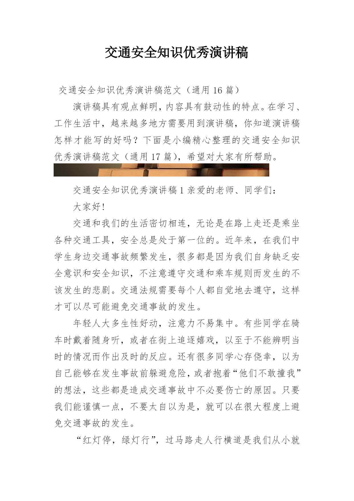 交通安全知识优秀演讲稿交通安全知识优秀演讲稿范文(通用16篇)演讲稿具有观点鲜明,内容具有鼓动性的特点。在学习、工作生活中,越来越多地方需要用到演讲稿,你知道演讲稿怎样才能写的好吗?下面是小编精心整理的交通安全知识优秀演讲稿范文(通用17篇),希望对大家有所帮助。交通安全知识优秀演讲稿1亲爱的老师、同学们:大家好!交通和我们的生活密切相连,无论是在路上走还是乘坐各种交通工具,安全总是处于第一位的。近年来,在我们中学生身边交通事故频繁发生,很多都是因为我们自身缺乏安全意识和安全知识,不注意遵守交通和乘车规则
