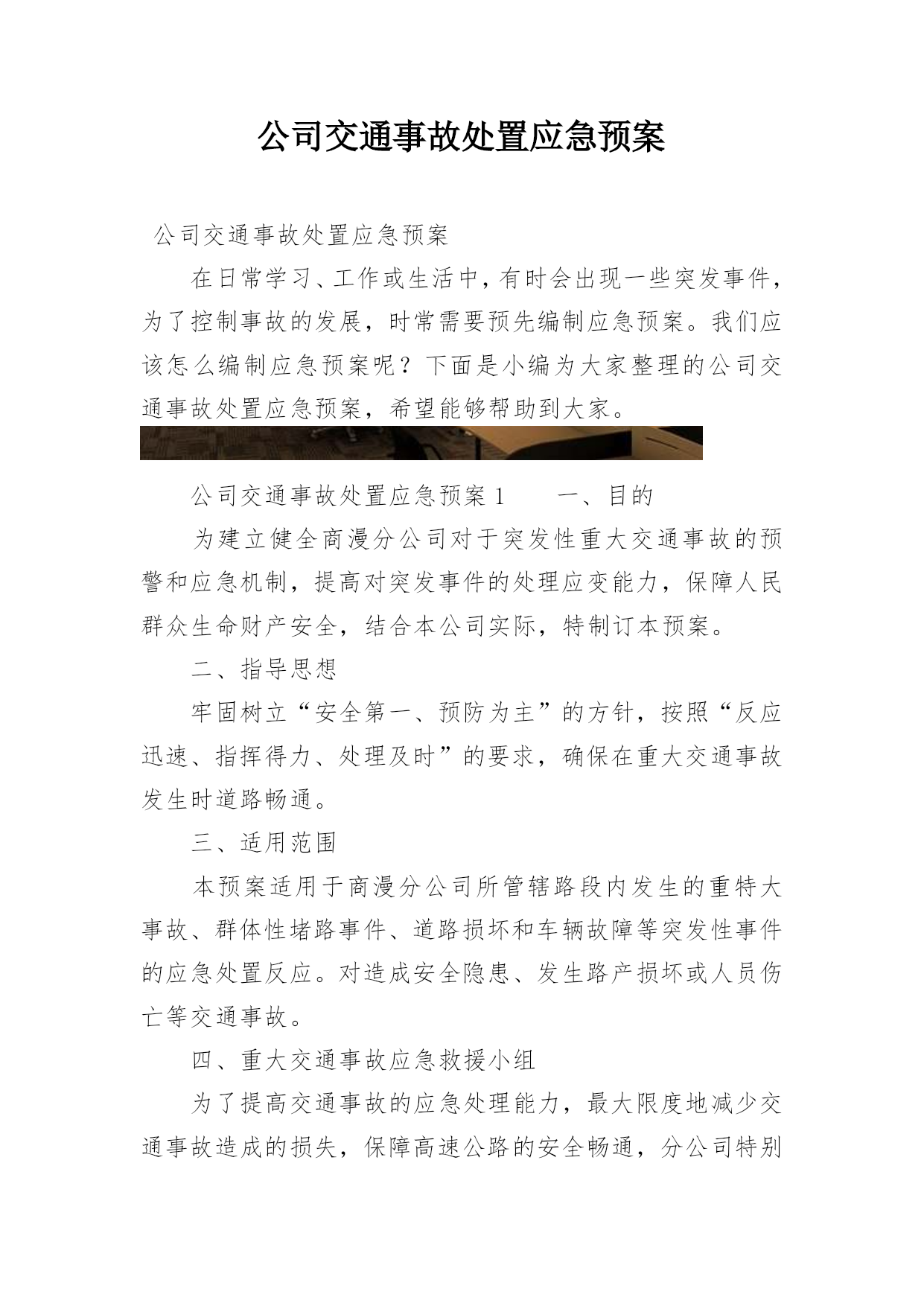 公司交通事故处置应急预案公司交通事故处置应急预案在日常学习、工作或生活中,有时会出现一些突发事件,为了控制事故的发展,时常需要预先编制应急预案。我们应该怎么编制应急预案呢?下面是小编为大家整理的公司交通事故处置应急预案,希望能够帮助到大家。公司交通事故处置应急预案1一、目的为建立健全商漫分公司对于突发性重大交通事故的预警和应急机制,提高对突发事件的处理应变能力,保障人民群众生命财产安全,结合本公司实际,特制订本预案。二、指导思想牢固树立“安全第一、预防为主”的方针,按照“反应迅速、指挥得力、处理及时”的要