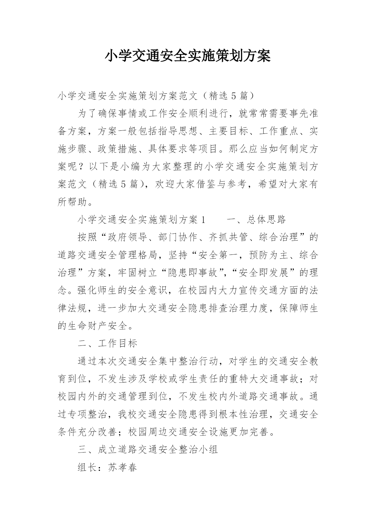 小学交通安全实施策划方案小学交通安全实施策划方案范文(精选5篇)为了确保事情或工作安全顺利进行,就常常需要事先准备方案,方案一般包括指导思想、主要目标、工作重点、实施步骤、政策措施、具体要求等项目。那么应当如何制定方案呢?以下是小编为大家整理的小学交通安全实施策划方案范文(精选5篇),欢迎大家借鉴与参考,希望对大家有所帮助。小学交通安全实施策划方案1一、总体思路按照“政府领导、部门协作、齐抓共管、综合治理”的道路交通安全管理格局,坚持“安全第一,预防为主、综合治理”方案,牢固树立“隐患即事故”,“安全即发