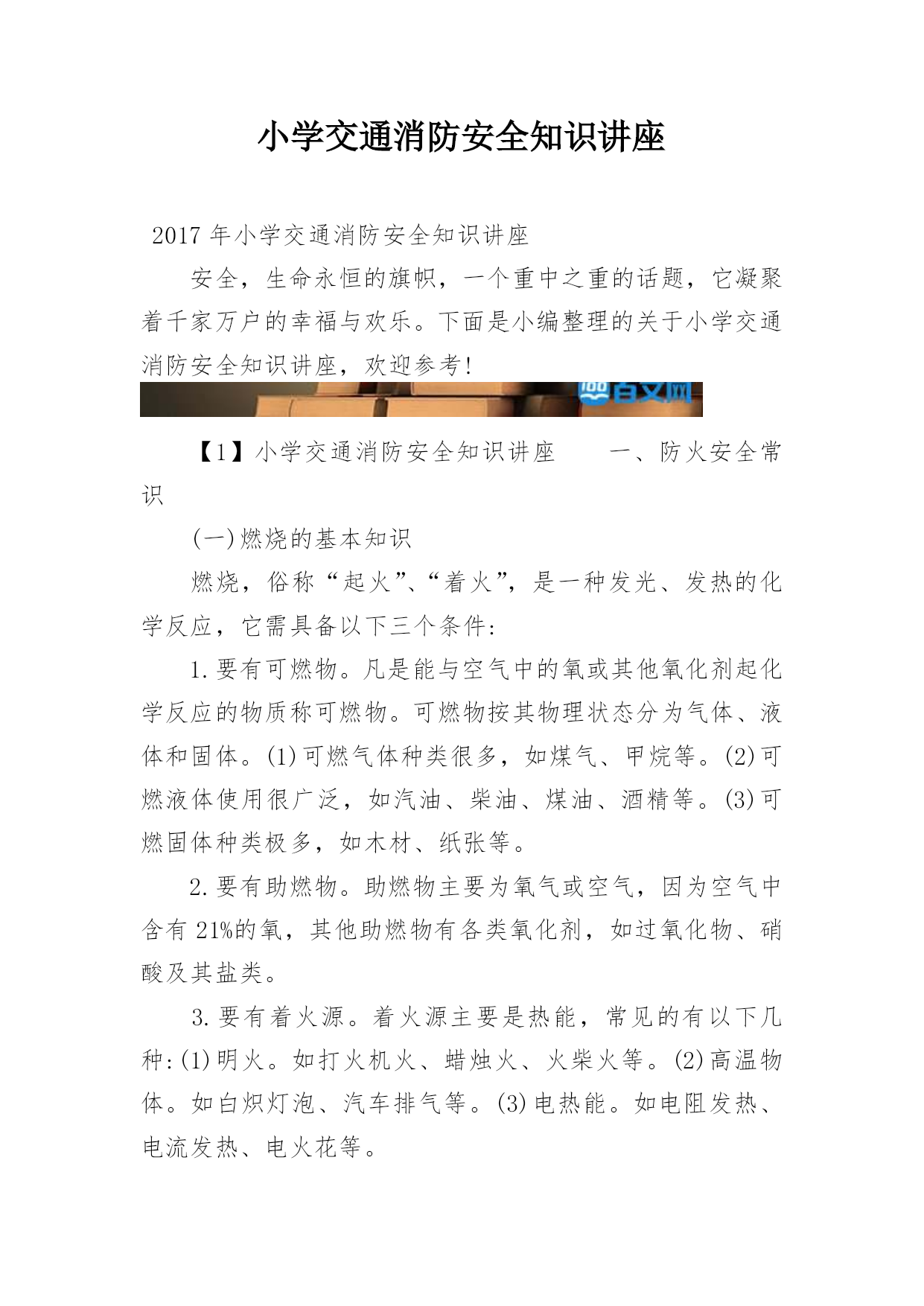 小学交通消防安全知识讲座2017年小学交通消防安全知识讲座安全,生命永恒的旗帜,一个重中之重的话题,它凝聚着千家万户的幸福与欢乐。下面是小编整理的关于小学交通消防安全知识讲座,欢迎参考!【1】小学交通消防安全知识讲座一、防火安全常识(一)燃烧的基本知识燃烧,俗称“起火”、“着火”,是一种发光、发热的化学反应,它需具备以下三个条件:1.要有可燃物。凡是能与空气中的氧或其他氧化剂起化学反应的物质称可燃物。可燃物按其物理状态分为气体、液体和固体。(1)可燃气体种类很多,如煤气、甲烷等。(2)可燃液体使用很广泛,