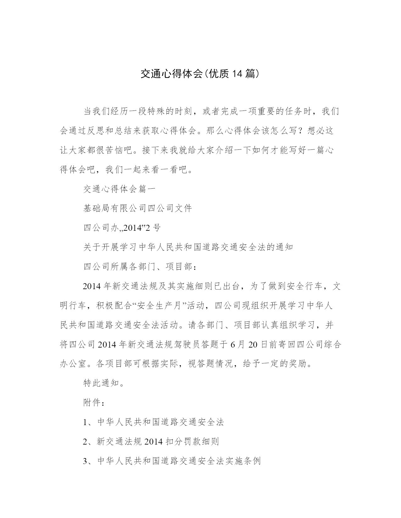 交通心得体会(优质14篇)当我们经历一段特殊的时刻,或者完成一项重要的任务时,我们会通过反思和总结来获取心得体会。那么心得体会该怎么写?想必这让大家都很苦恼吧。接下来我就给大家介绍一下如何才能写好一篇心得体会吧,我们一起来看一看吧。交通心得体会篇一基础局有限公司四公司文件四公司办„2014‟2号关于开展学习中华人民共和国道路交通安全法的通知四公司所属各部门、项目部:2014年新交通法规及其实施细则已出台,为了做到安全行车,文明行车,积极配合“安全生产月”活动,四公司现组织开展学习中华人民共和国道路交通安全