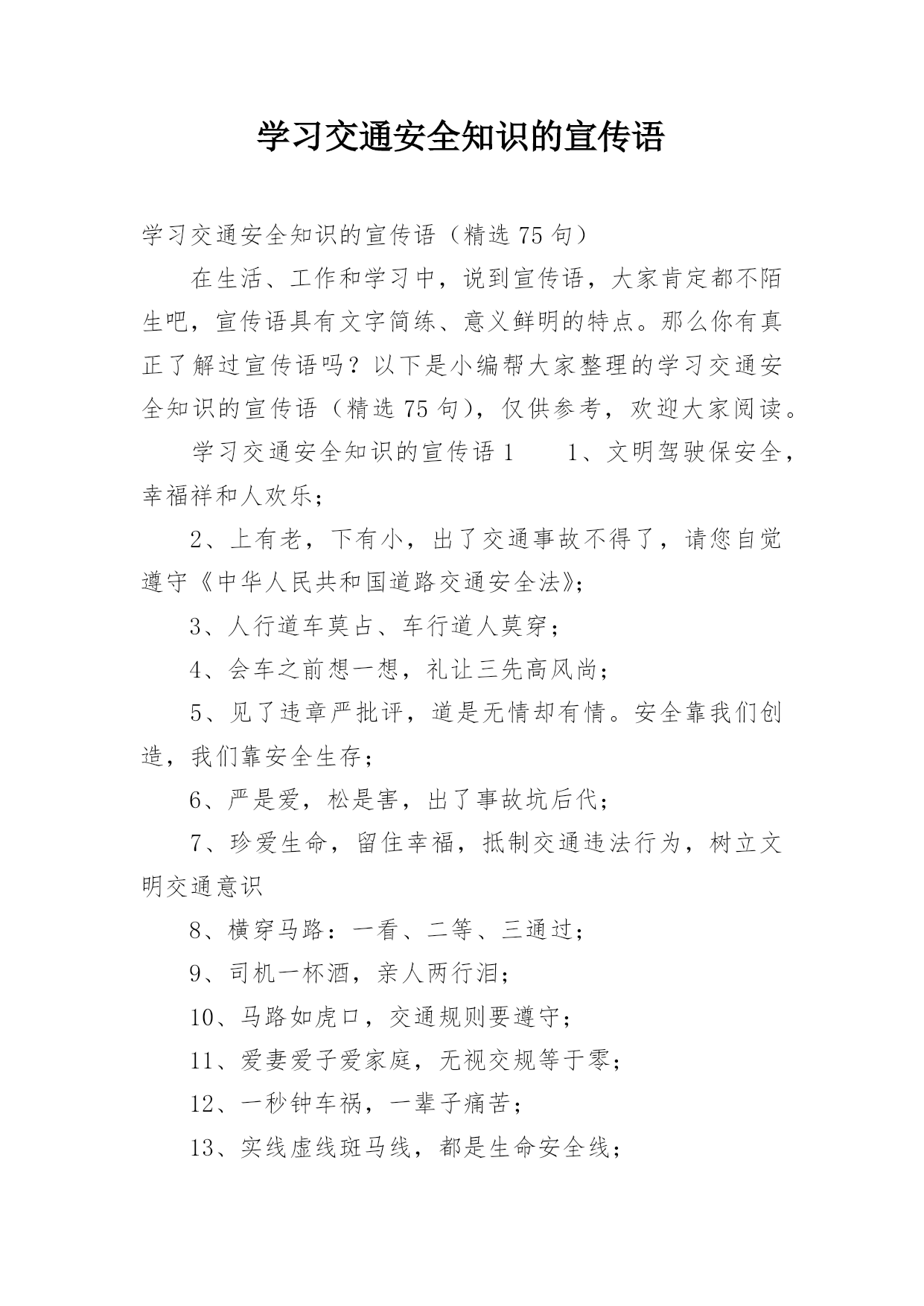 学习交通安全知识的宣传语学习交通安全知识的宣传语(精选75句)在生活、工作和学习中,说到宣传语,大家肯定都不陌生吧,宣传语具有文字简练、意义鲜明的特点。那么你有真正了解过宣传语吗?以下是小编帮大家整理的学习交通安全知识的宣传语(精选75句),仅供参考,欢迎大家阅读。学习交通安全知识的宣传语11、文明驾驶保安全,幸福祥和人欢乐;2、上有老,下有小,出了交通事故不得了,请您自觉遵守《中华人民共和国道路交通安全法》;3、人行道车莫占、车行道人莫穿;4、会车之前想一想,礼让三先高风尚;5、见了违章严批评,道是无情