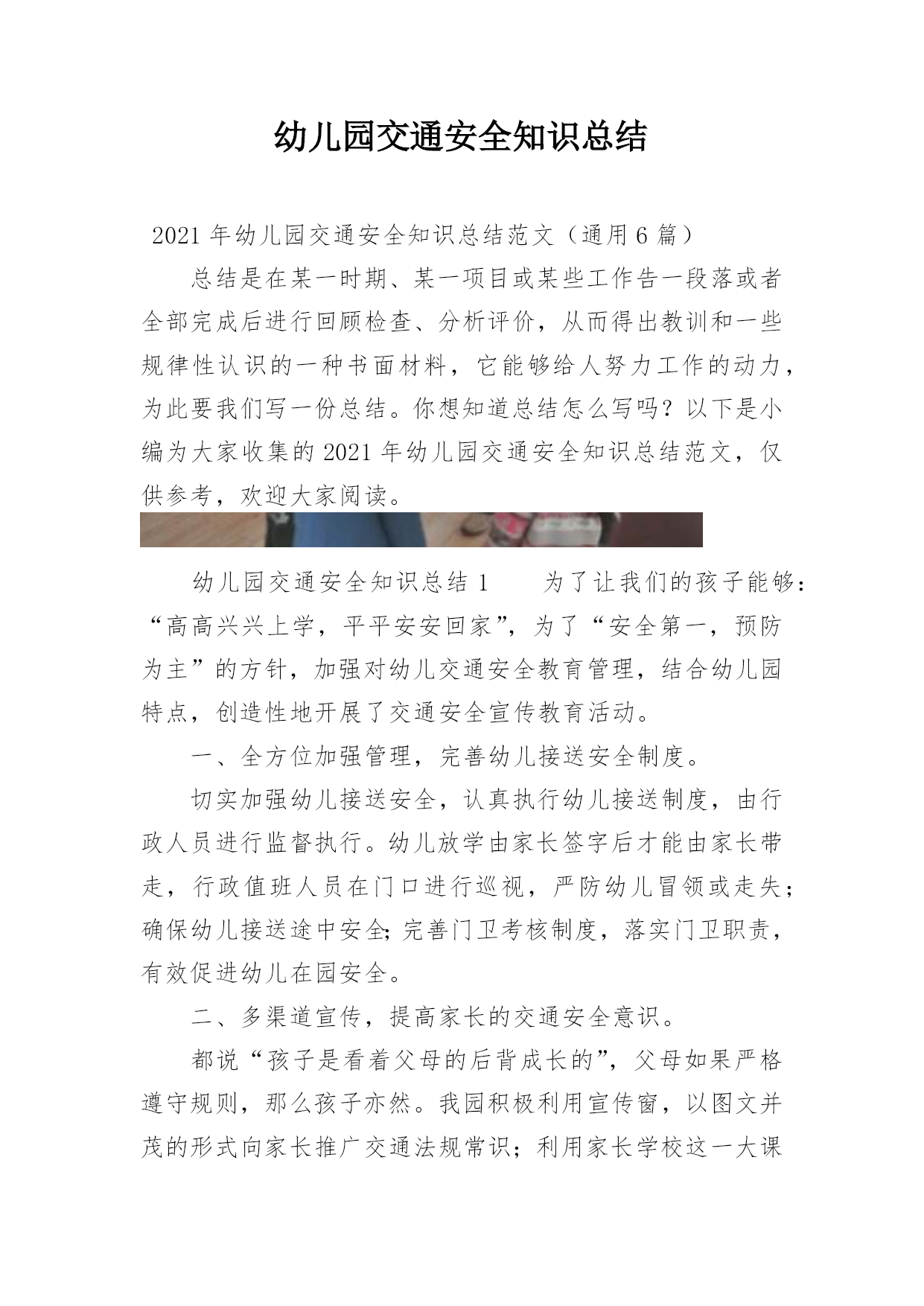 幼儿园交通安全知识总结2021年幼儿园交通安全知识总结范文(通用6篇)总结是在某一时期、某一项目或某些工作告一段落或者全部完成后进行回顾检查、分析评价,从而得出教训和一些规律性认识的一种书面材料,它能够给人努力工作的动力,为此要我们写一份总结。你想知道总结怎么写吗?以下是小编为大家收集的2021年幼儿园交通安全知识总结范文,仅供参考,欢迎大家阅读。幼儿园交通安全知识总结1为了让我们的孩子能够:“高高兴兴上学,平平安安回家”,为了“安全第一,预防为主”的方针,加强对幼儿交通安全教育管理,结合幼儿园特点,创造