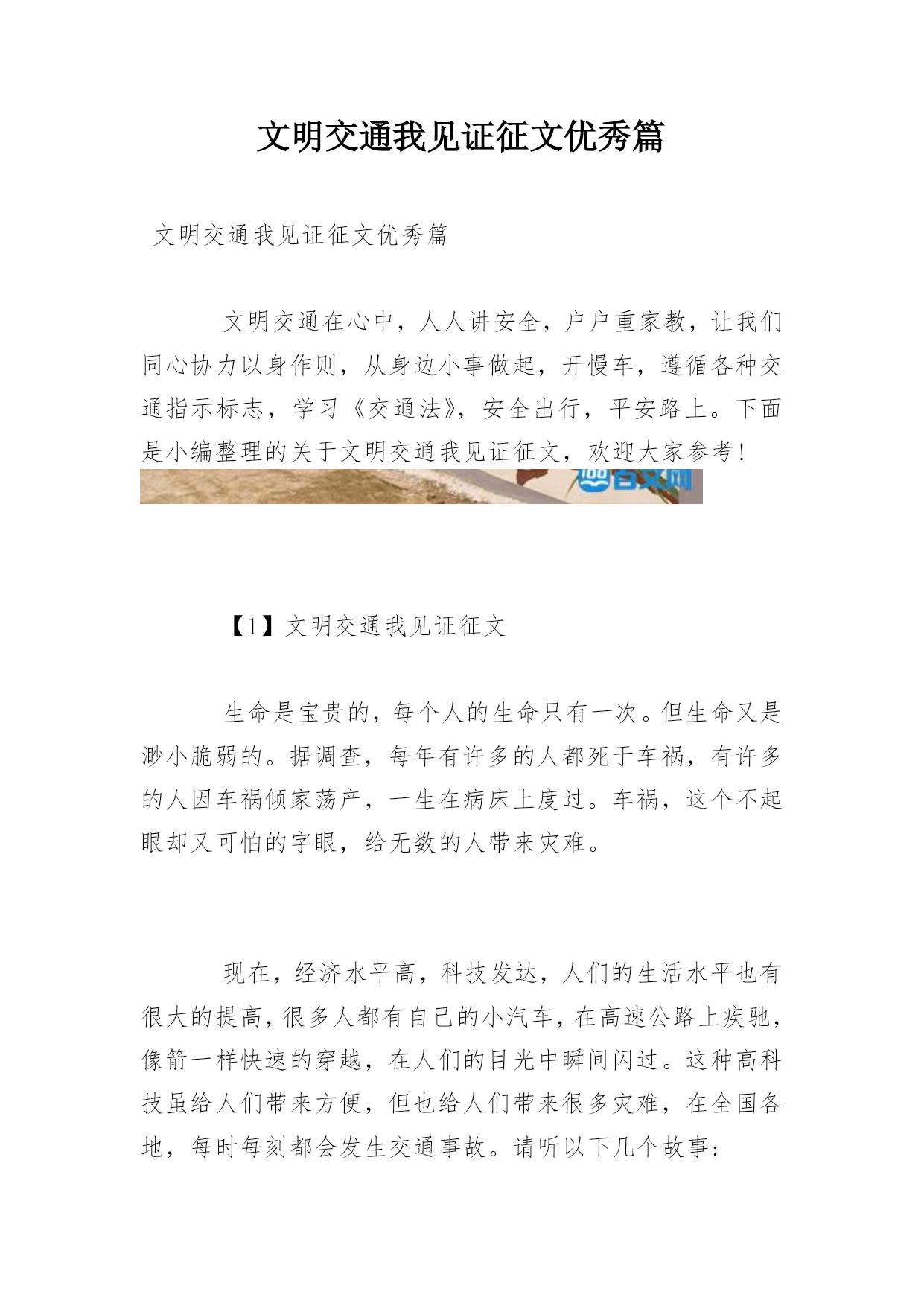 文明交通我见证征文优秀篇文明交通我见证征文优秀篇文明交通在心中,人人讲安全,户户重家教,让我们同心协力以身作则,从身边小事做起,开慢车,遵循各种交通指示标志,学习《交通法》,安全出行,平安路上。下面是小编整理的关于文明交通我见证征文,欢迎大家参考!【1】文明交通我见证征文生命是宝贵的,每个人的生命只有一次。但生命又是渺小脆弱的。据调查,每年有许多的人都死于车祸,有许多的人因车祸倾家荡产,一生在病床上度过。车祸,这个不起眼却又可怕的字眼,给无数的人带来灾难。现在,经济水平高,科技发达,人们的生活水平也有很大