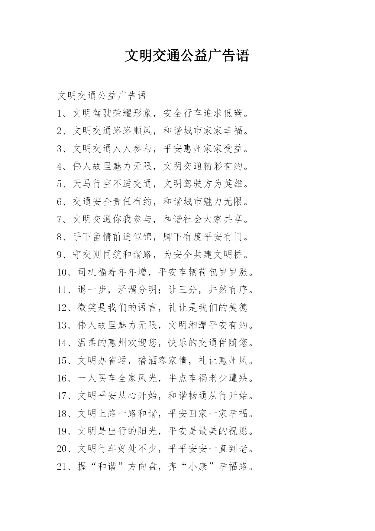 文明交通公益广告语文明交通公益广告语1、文明驾驶荣耀形象,安全行车追求低碳。2、文明交通路路顺风,和谐城市家家幸福。3、文明交通人人参与,平安惠州家家受益。4、伟人故里魅力无限,文明交通精彩有约。5、天马行空不适交通,文明驾驶方为英雄。6、交通安全责任有约,和谐城市魅力无限。7、文明交通你我参与,和谐社会大家共享。8、手下留情前途似锦,脚下有度平安有门。9、守交则同筑和谐路,为安全共建文明桥。10、司机福寿年年增,平安车辆荷包岁岁涨。11、退一步,泾渭分明;让三分,井然有序。12、微笑是我们的语言,礼让是