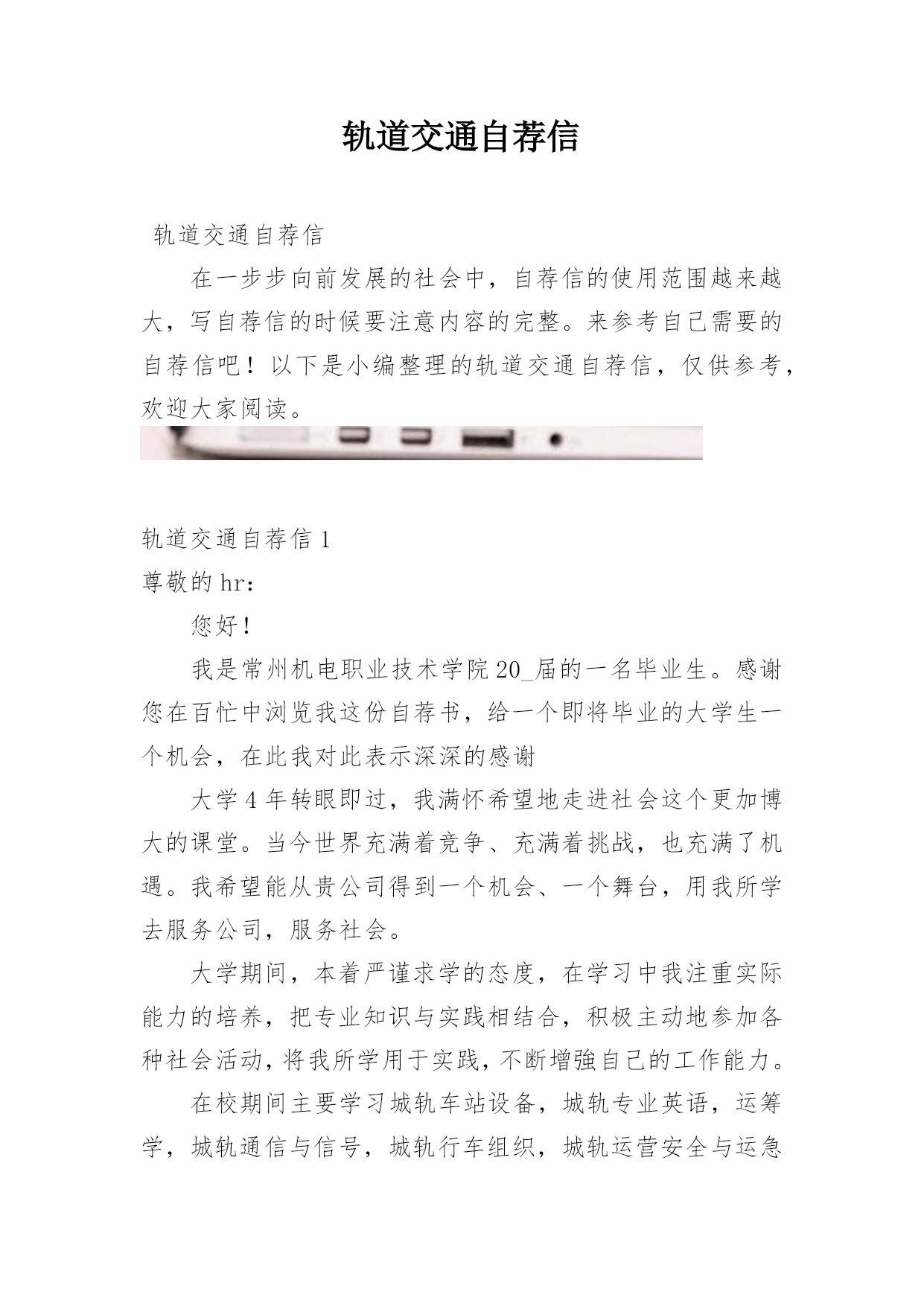 轨道交通自荐信轨道交通自荐信在一步步向前发展的社会中,自荐信的使用范围越来越大,写自荐信的时候要注意内容的完整。来参考自己需要的自荐信吧!以下是小编整理的轨道交通自荐信,仅供参考,欢迎大家阅读。轨道交通自荐信1尊敬的hr:您好!我是常州机电职业技术学院20_届的一名毕业生。感谢您在百忙中浏览我这份自荐书,给一个即将毕业的大学生一个机会,在此我对此表示深深的感谢大学4年转眼即过,我满怀希望地走进社会这个更加博大的课堂。当今世界充满着竞争、充满着挑战,也充满了机遇。我希望能从贵公司得到一个机会、一个舞台,用我