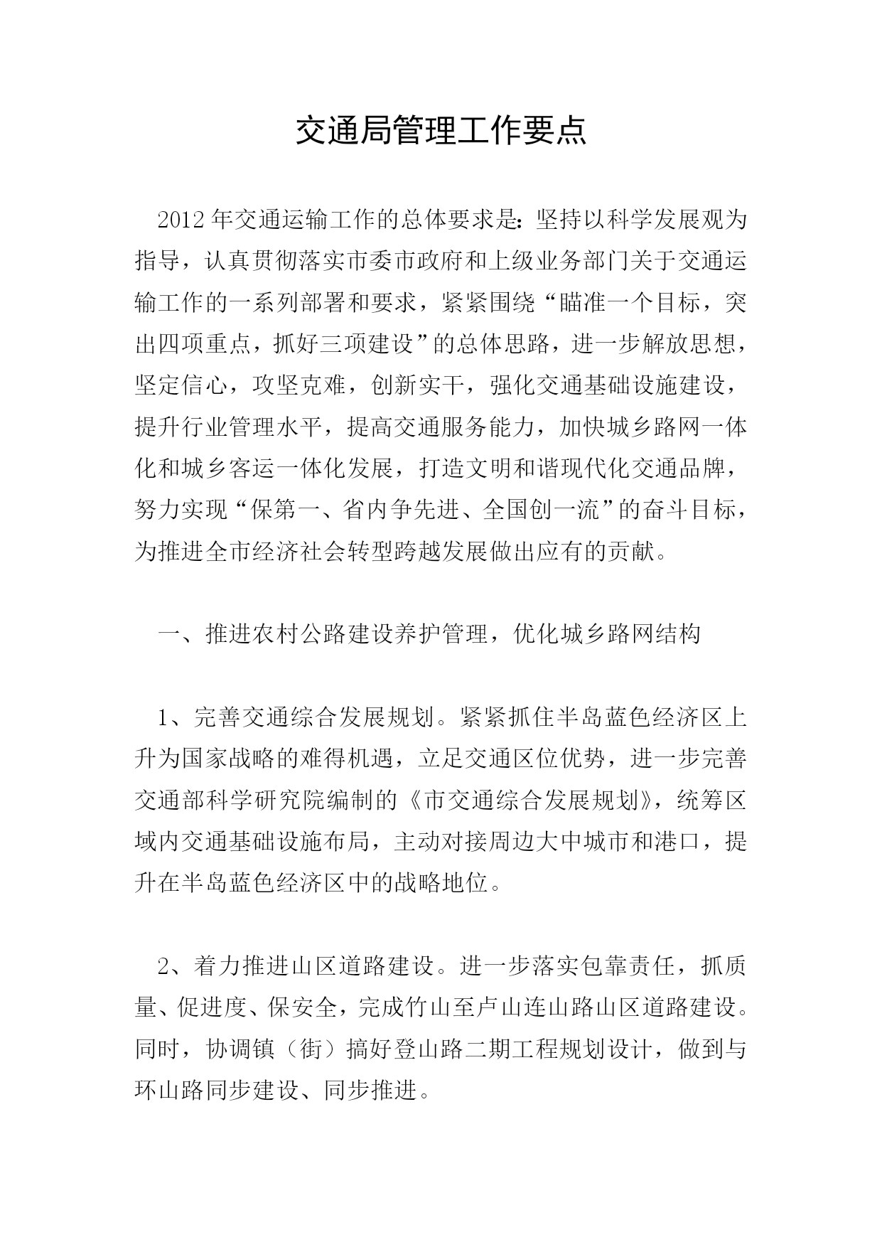 交通局管理工作要点2012年交通运输工作的总体要求是:坚持以科学发展观为指导,认真贯彻落实市委市政府和上级业务部门关于交通运输工作的一系列部署和要求,紧紧围绕“瞄准一个目标,突出四项重点,抓好三项建设”的总体思路,进一步解放思想,坚定信心,攻坚克难,创新实干,强化交通基础设施建设,提升行业管理水平,提高交通服务能力,加快城乡路网一体化和城乡客运一体化发展,打造文明和谐现代化交通品牌,努力实现“保第一、省内争先进、全国创一流”的奋斗目标,为推进全市经济社会转型跨越发展做出应有的贡献。一、推进农村公路建设养护