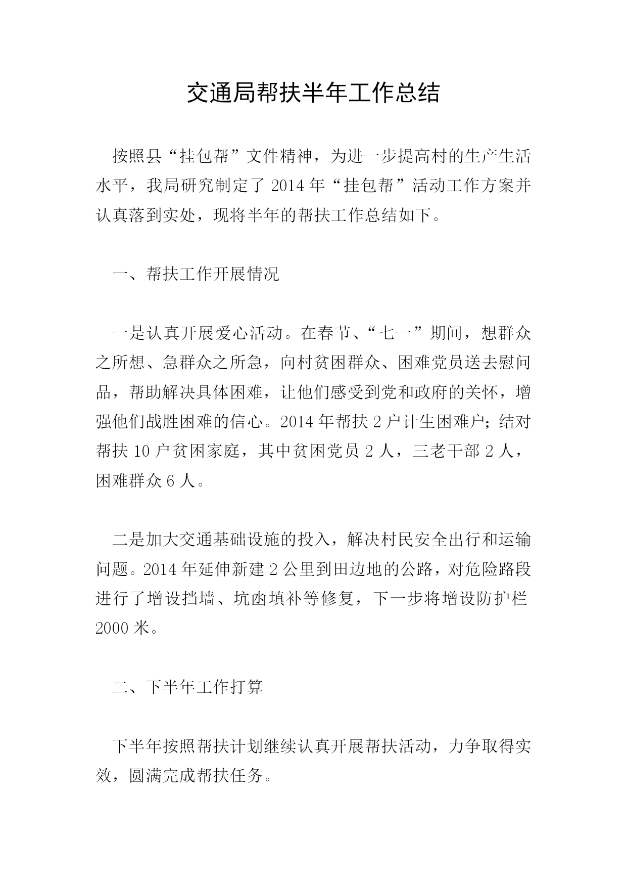 交通局帮扶半年工作总结按照县“挂包帮”文件精神,为进一步提高村的生产生活水平,我局研究制定了2014年“挂包帮”活动工作方案并认真落到实处,现将半年的帮扶工作总结如下。一、帮扶工作开展情况一是认真开展爱心活动。在春节、“七一”期间,想群众之所想、急群众之所急,向村贫困群众、困难党员送去慰问品,帮助解决具体困难,让他们感受到党和政府的关怀,增强他们战胜困难的信心。2014年帮扶2户计生困难户;结对帮扶10户贫困家庭,其中贫困党员2人,三老干部2人,困难群众6人。二是加大交通基础设施的投入,解决村民安全出行和