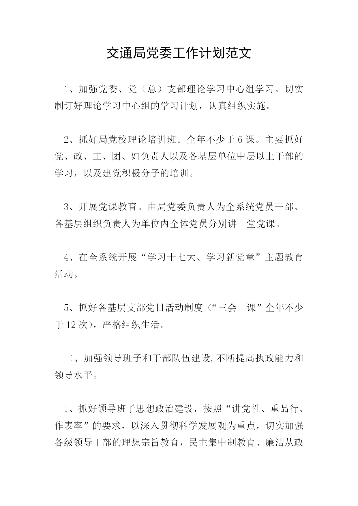 交通局党委工作计划范文1、加强党委、党(总)支部理论学习中心组学习。切实制订好理论学习中心组的学习计划,认真组织实施。2、抓好局党校理论培训班。全年不少于6课。主要抓好党、政、工、团、妇负责人以及各基层单位中层以上干部的学习,以及建党积极分子的培训。3、开展党课教育。由局党委负责人为全系统党员干部、各基层组织负责人为单位内全体党员分别讲一堂党课。4、在全系统开展“学习十七大、学习新党章”主题教育活动。5、抓好各基层支部党日活动制度(“三会一课”全年不少于12次),严格组织生活。二、加强领导班子和干部队伍建
