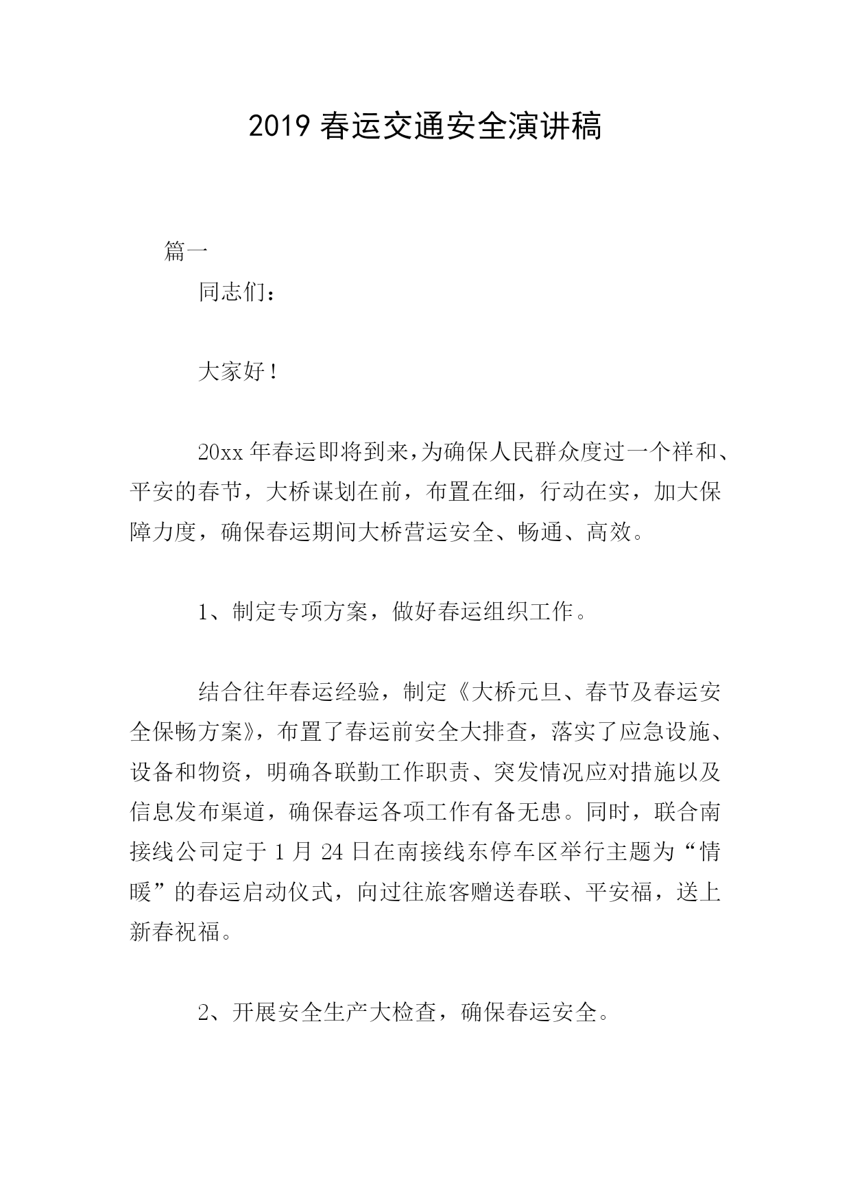 2019春运交通安全演讲稿篇一同志们:大家好!20xx年春运即将到来,为确保人民群众度过一个祥和、平安的春节,大桥谋划在前,布置在细,行动在实,加大保障力度,确保春运期间大桥营运安全、畅通、高效。1、制定专项方案,做好春运组织工作。结合往年春运经验,制定《大桥元旦、春节及春运安全保畅方案》,布置了春运前安全大排查,落实了应急设施、设备和物资,明确各联勤工作职责、突发情况应对措施以及信息发布渠道,确保春运各项工作有备无患。同时,联合南接线公司定于1月24日在南接线东停车区举行主题为“情暖”的春运启动仪式,向