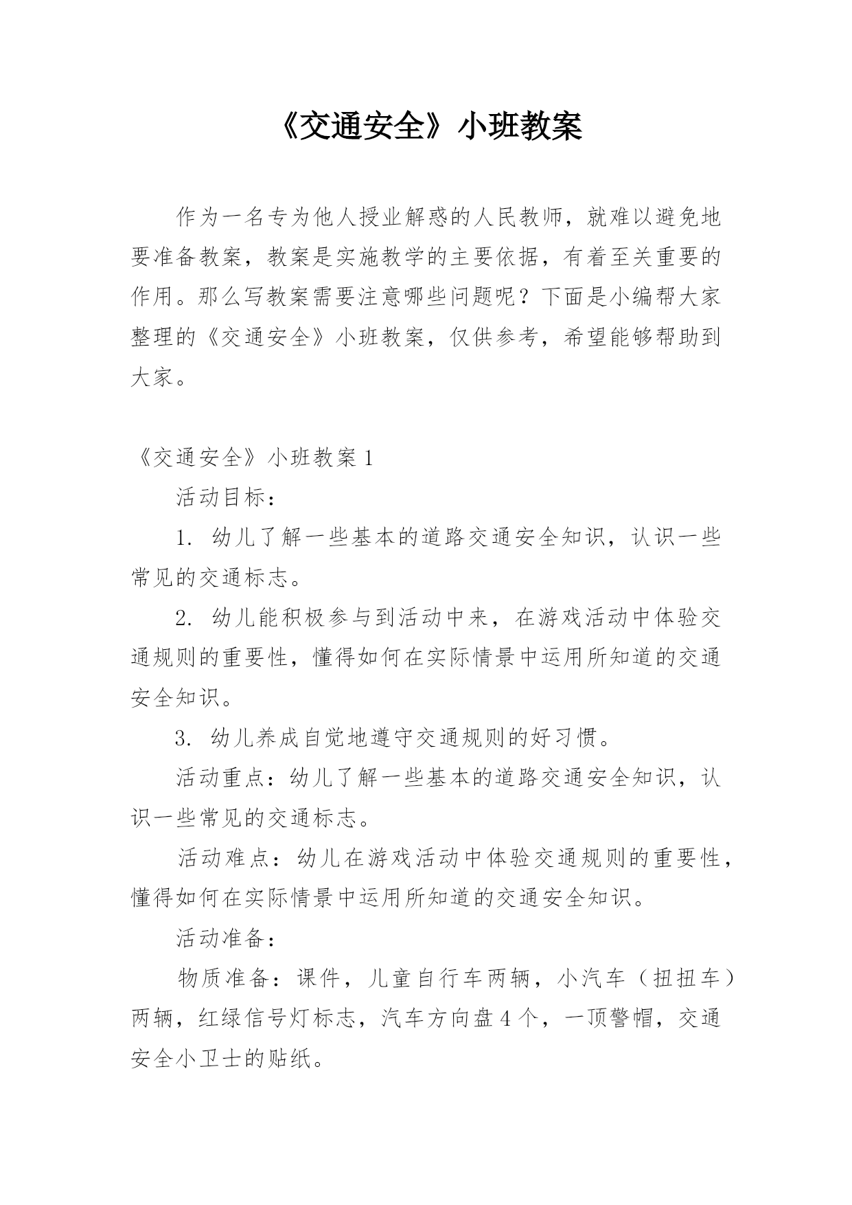 《交通安全》小班教案作为一名专为他人授业解惑的人民教师,就难以避免地要准备教案,教案是实施教学的主要依据,有着至关重要的作用。那么写教案需要注意哪些问题呢?下面是小编帮大家整理的《交通安全》小班教案,仅供参考,希望能够帮助到大家。《交通安全》小班教案1活动目标:1.幼儿了解一些基本的道路交通安全知识,认识一些常见的交通标志。2.幼儿能积极参与到活动中来,在游戏活动中体验交通规则的重要性,懂得如何在实际情景中运用所知道的交通安全知识。3.幼儿养成自觉地遵守交通规则的好习惯。活动重点:幼儿了解一些基本的道路交