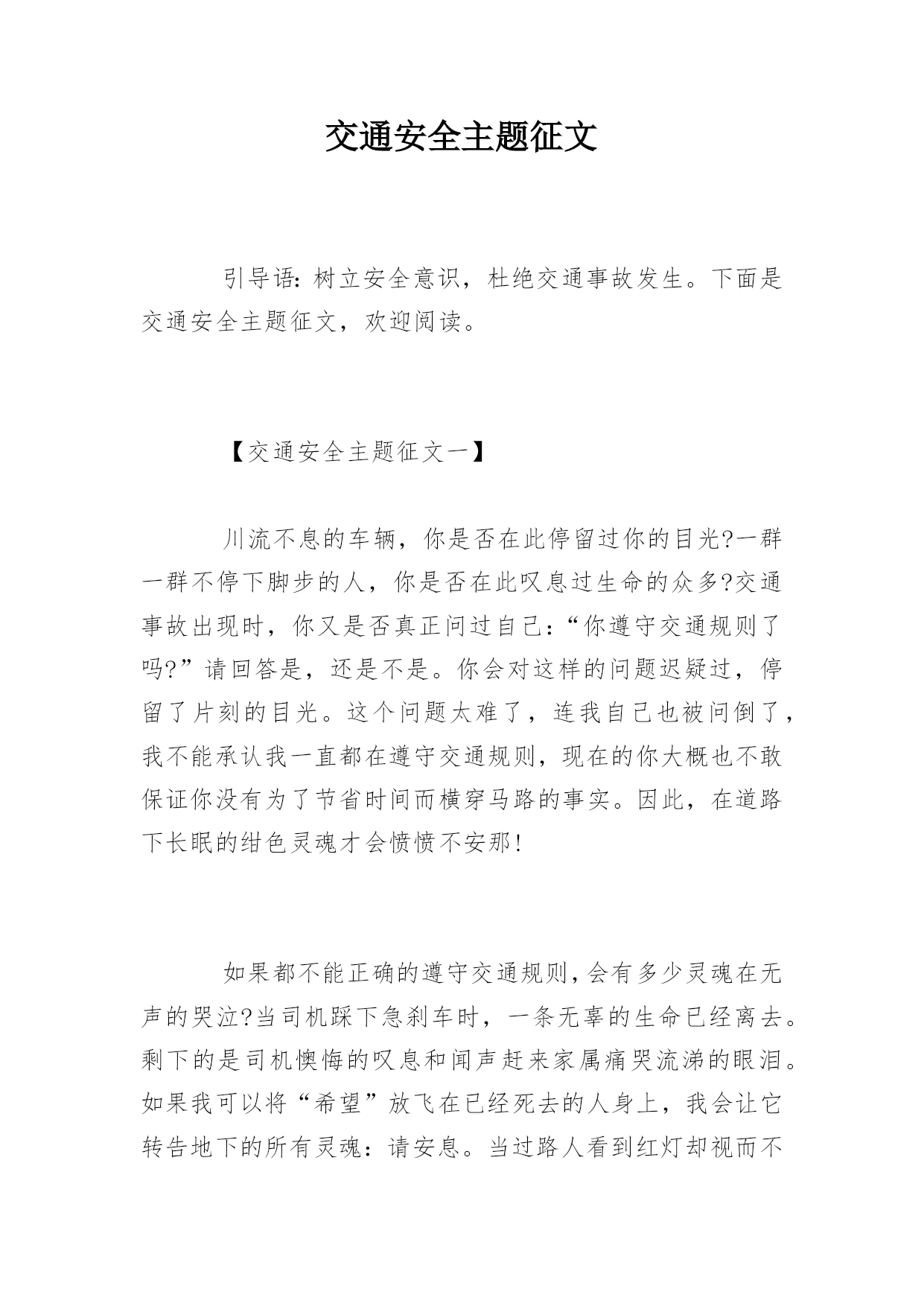 交通安全主题征文引导语:树立安全意识,杜绝交通事故发生。下面是交通安全主题征文,欢迎阅读。【交通安全主题征文一】川流不息的车辆,你是否在此停留过你的目光?一群一群不停下脚步的人,你是否在此叹息过生命的众多?交通事故出现时,你又是否真正问过自己:“你遵守交通规则了吗?”请回答是,还是不是。你会对这样的问题迟疑过,停留了片刻的目光。这个问题太难了,连我自己也被问倒了,我不能承认我一直都在遵守交通规则,现在的你大概也不敢保证你没有为了节省时间而横穿马路的事实。因此,在道路下长眠的绀色灵魂才会愤愤不安那!如果都不
