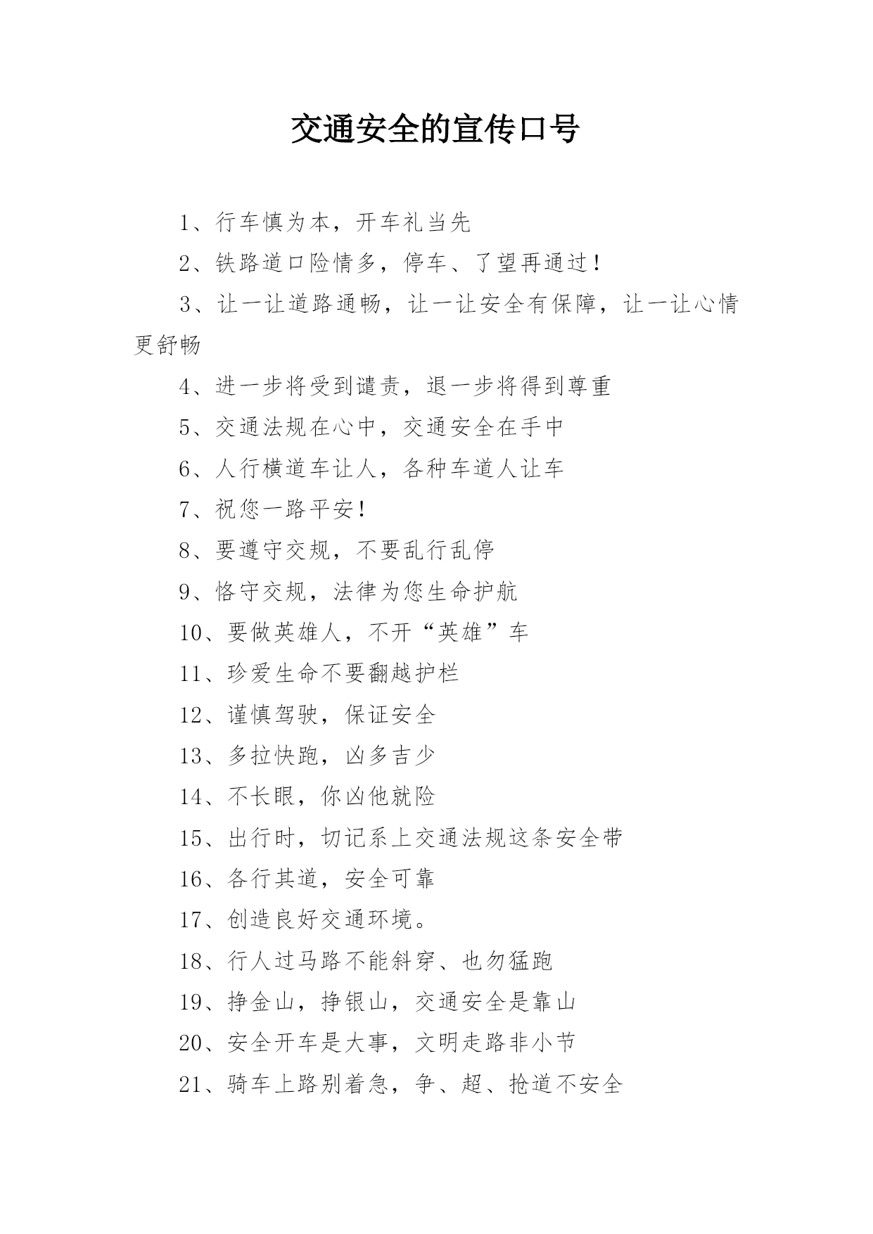 交通安全的宣传口号1、行车慎为本,开车礼当先2、铁路道口险情多,停车、了望再通过!3、让一让道路通畅,让一让安全有保障,让一让心情更舒畅4、进一步将受到谴责,退一步将得到尊重5、交通法规在心中,交通安全在手中6、人行横道车让人,各种车道人让车7、祝您一路平安!8、要遵守交规,不要乱行乱停9、恪守交规,法律为您生命护航10、要做英雄人,不开“英雄”车11、珍爱生命不要翻越护栏12、谨慎驾驶,保证安全13、多拉快跑,凶多吉少14、不长眼,你凶他就险15、出行时,切记系上交通法规这条安全带16、各行其道,安全可