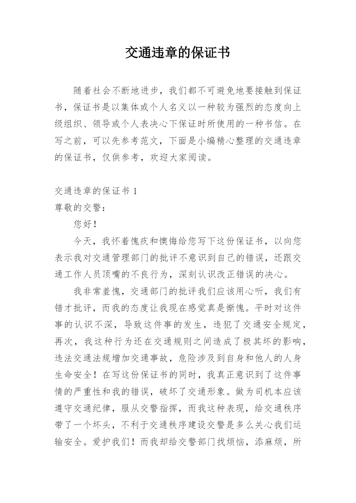 交通违章的保证书随着社会不断地进步,我们都不可避免地要接触到保证书,保证书是以集体或个人名义以一种较为强烈的态度向上级组织、领导或个人表决心下保证时所使用的一种书信。在写之前,可以先参考范文,下面是小编精心整理的交通违章的保证书,仅供参考,欢迎大家阅读。交通违章的保证书1尊敬的交警:您好!今天,我怀着愧疚和懊悔给您写下这份保证书,以向您表示我对交通管理部门的批评不意识到自己的错误,还跟交通工作人员顶嘴的不良行为,深刻认识改正错误的决心。我非常羞愧,交通部门的批评我们应该用心听,我们有错才批评,而我的态度让