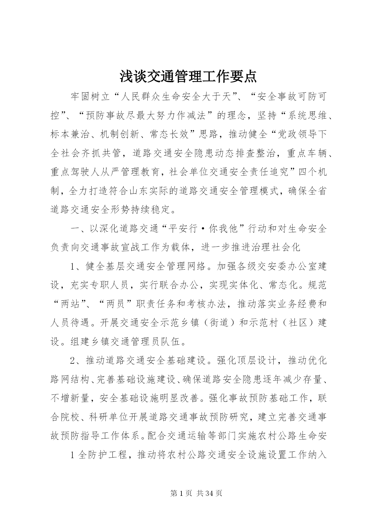 第PAGE\*Arabic\*MERGEFORMAT34页共NUMPAGES\*MERGEFORMAT34页浅谈交通管理工作要点牢固树立“人民群众生命安全大于天”、“安全事故可防可控”、“预防事故尽最大努力作减法”的理念,坚持“系统思维、标本兼治、机制创新、常态长效”思路,推动健全“党政领导下全社会齐抓共管,道路交通安全隐患动态排查整治,重点车辆、重点驾驶人从严管理教育,社会单位交通安全责任追究”四个机制,全力打造符合山东实际的道路交通安全管理模式,确保全省道路交通安全形势持续稳定。一、以深化