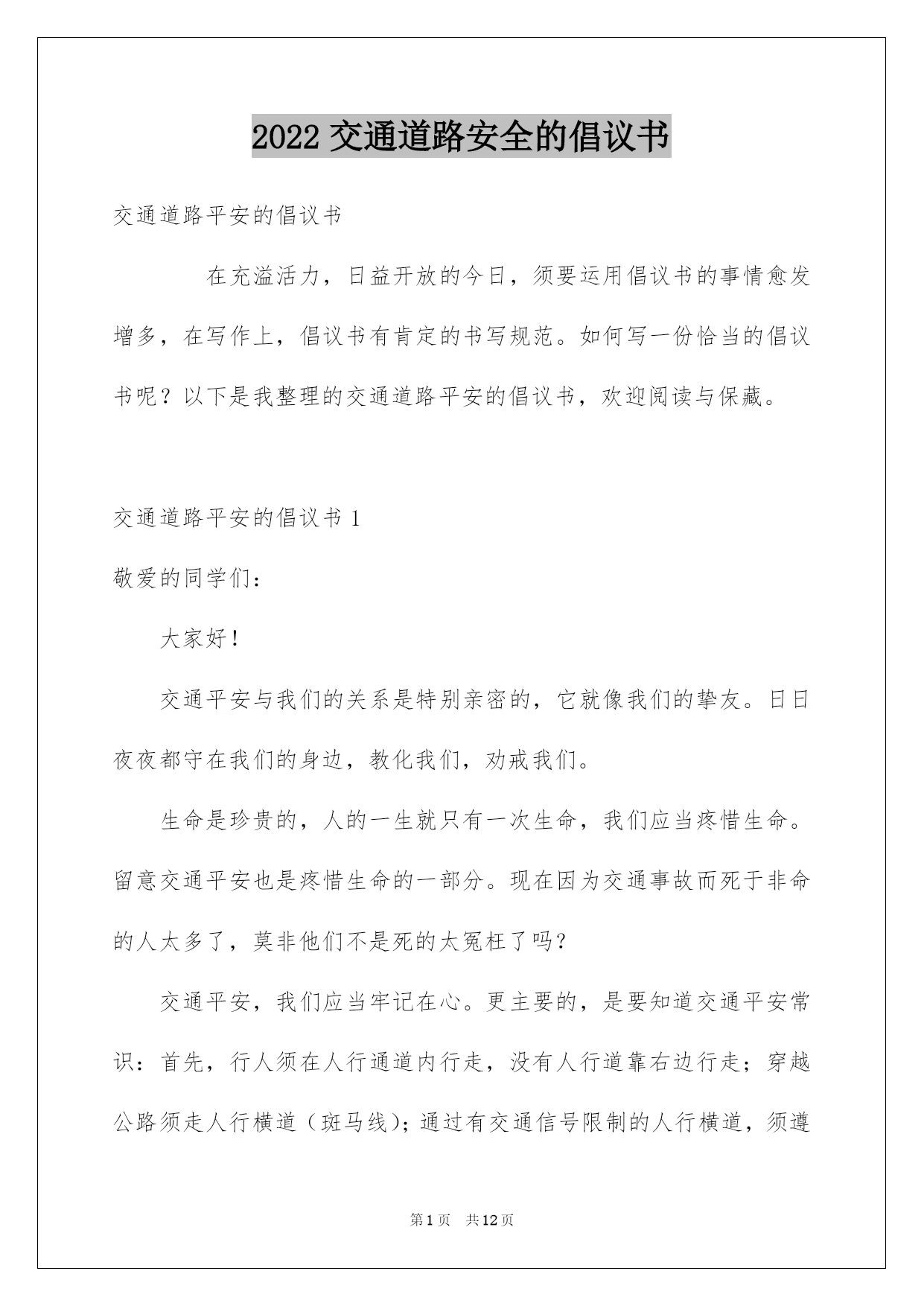2022交通道路安全的倡议书.docx