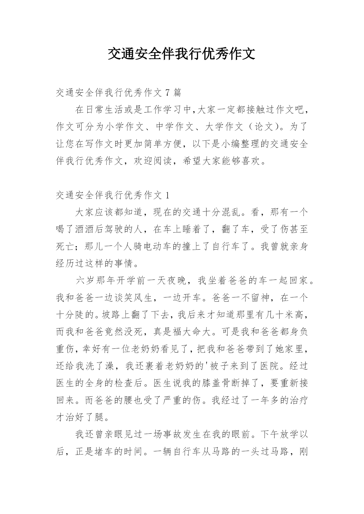 交通安全伴我行优秀作文交通安全伴我行优秀作文7篇在日常生活或是工作学习中,大家一定都接触过作文吧,作文可分为小学作文、中学作文、大学作文(论文)。为了让您在写作文时更加简单方便,以下是小编整理的交通安全伴我行优秀作文,欢迎阅读,希望大家能够喜欢。交通安全伴我行优秀作文1大家应该都知道,现在的交通十分混乱。看,那有一个喝了酒酒后驾驶的人,在车上睡着了,翻了车,受了伤甚至死亡;那儿一个人骑电动车的撞上了自行车了。我曾就亲身经历过这样的事情。六岁那年开学前一天夜晚,我坐着爸爸的车一起回家。我和爸爸一边谈笑风生,