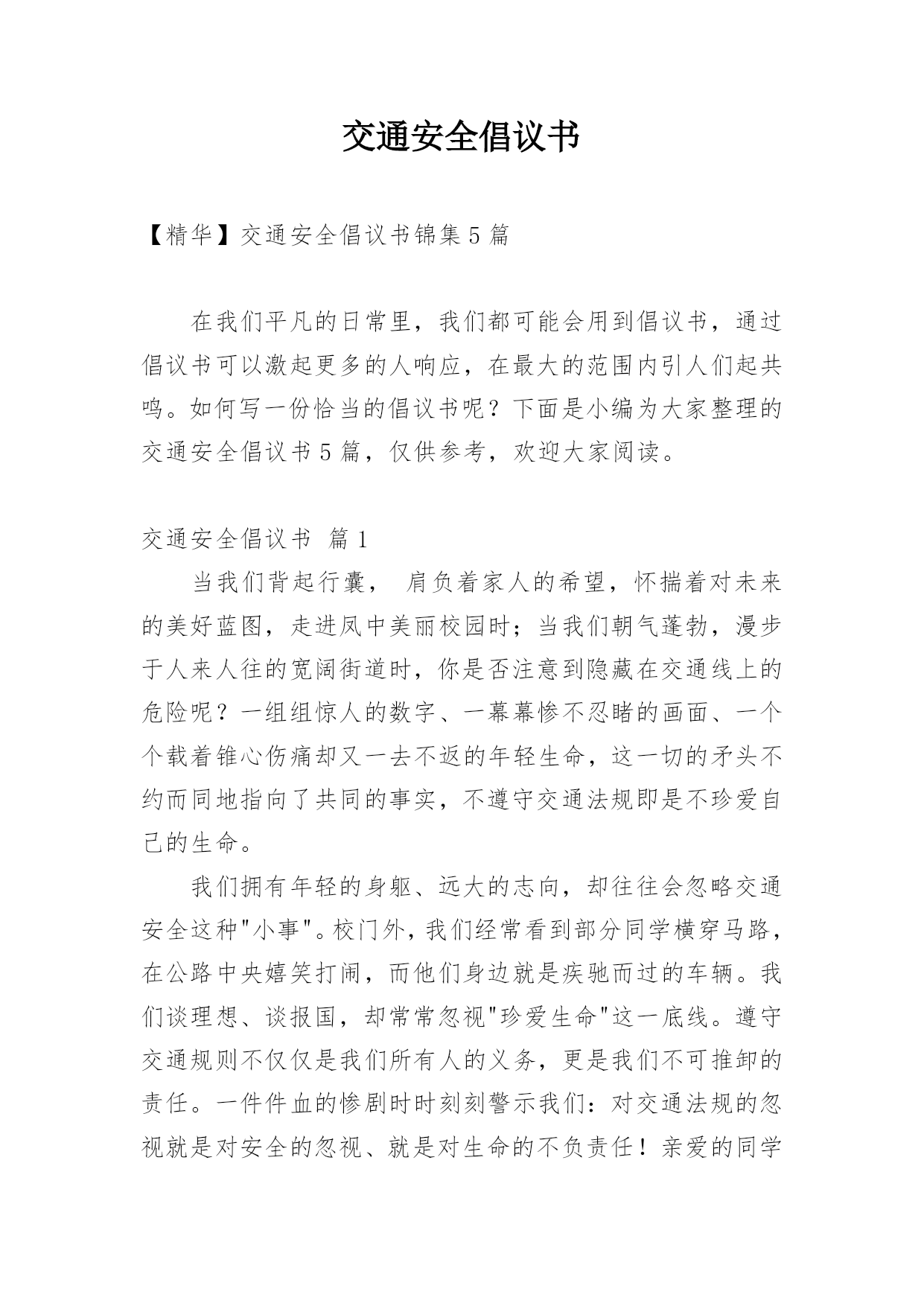交通安全倡议书【精华】交通安全倡议书锦集5篇在我们平凡的日常里,我们都可能会用到倡议书,通过倡议书可以激起更多的人响应,在最大的范围内引人们起共鸣。如何写一份恰当的倡议书呢?下面是小编为大家整理的交通安全倡议书5篇,仅供参考,欢迎大家阅读。交通安全倡议书篇1当我们背起行囊,肩负着家人的希望,怀揣着对未来的美好蓝图,走进凤中美丽校园时;当我们朝气蓬勃,漫步于人来人往的宽阔街道时,你是否注意到隐藏在交通线上的危险呢?一组组惊人的数字、一幕幕惨不忍睹的画面、一个个载着锥心伤痛却又一去不返的年轻生命,这一切的矛头