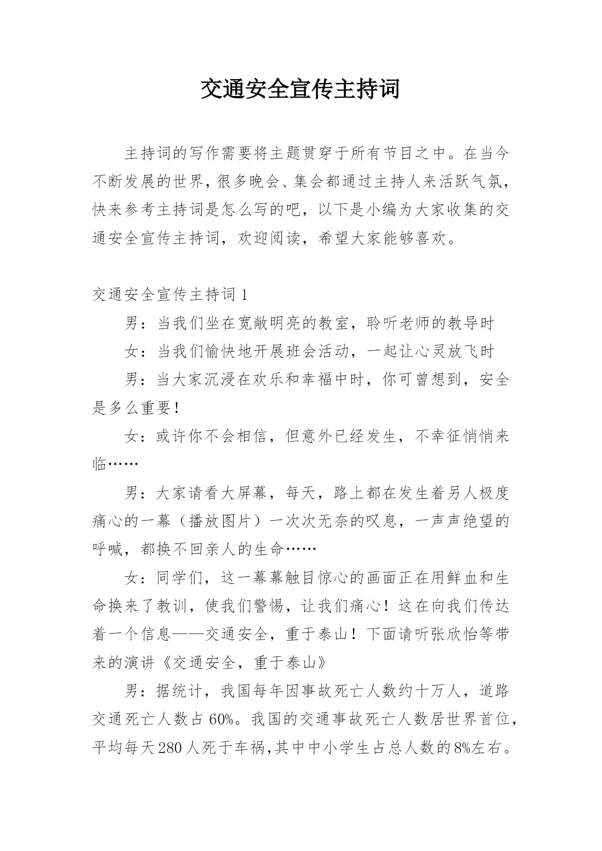 交通安全宣传主持词主持词的写作需要将主题贯穿于所有节目之中。在当今不断发展的世界,很多晚会、集会都通过主持人来活跃气氛,快来参考主持词是怎么写的吧,以下是小编为大家收集的交通安全宣传主持词,欢迎阅读,希望大家能够喜欢。交通安全宣传主持词1男:当我们坐在宽敞明亮的教室,聆听老师的教导时女:当我们愉快地开展班会活动,一起让心灵放飞时男:当大家沉浸在欢乐和幸福中时,你可曾想到,安全是多么重要!女:或许你不会相信,但意外已经发生,不幸征悄悄来临……男:大家请看大屏幕,每天,路上都在发生着另人极度痛心的一幕(播放图