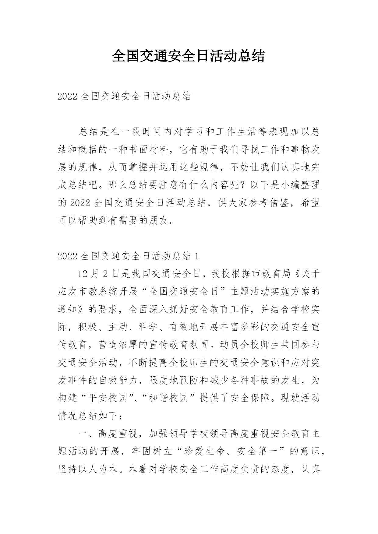 全国交通安全日活动总结2022全国交通安全日活动总结总结是在一段时间内对学习和工作生活等表现加以总结和概括的一种书面材料,它有助于我们寻找工作和事物发展的规律,从而掌握并运用这些规律,不妨让我们认真地完成总结吧。那么总结要注意有什么内容呢?以下是小编整理的2022全国交通安全日活动总结,供大家参考借鉴,希望可以帮助到有需要的朋友。2022全国交通安全日活动总结112月2日是我国交通安全日,我校根据市教育局《关于应发市教系统开展“全国交通安全日”主题活动实施方案的通知》的要求,全面深入抓好安全教育工作,并结