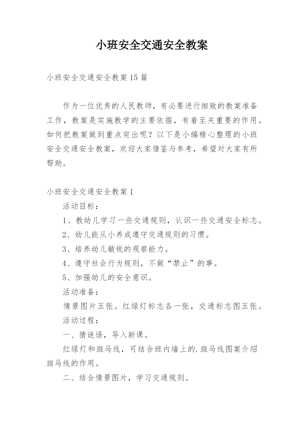 小班安全交通安全教案小班安全交通安全教案15篇作为一位优秀的人民教师,有必要进行细致的教案准备工作,教案是实施教学的主要依据,有着至关重要的作用。如何把教案做到重点突出呢?以下是小编精心整理的小班安全交通安全教案,欢迎大家借鉴与参考,希望对大家有所帮助。小班安全交通安全教案1活动目标:1、教幼儿学习一些交通规则,认识一些交通安全标志。2、幼儿能从小养成遵守交通规则的习惯。3、培养幼儿敏锐的观察能力。4、遵守社会行为规则,不做“禁止”的事。5、加强幼儿的安全意识。活动准备:情景图片五张。红绿灯标志各一张,交