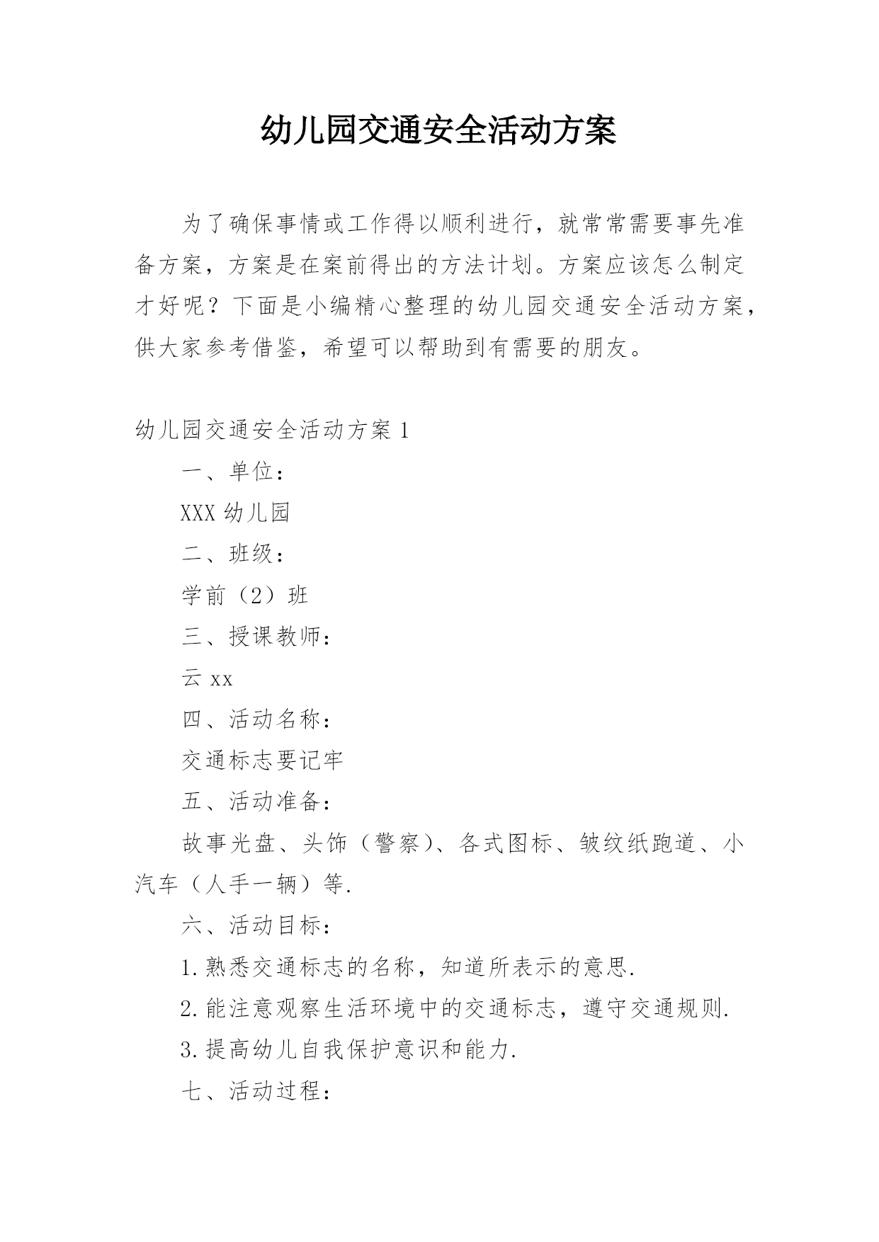 幼儿园交通安全活动方案为了确保事情或工作得以顺利进行,就常常需要事先准备方案,方案是在案前得出的方法计划。方案应该怎么制定才好呢?下面是小编精心整理的幼儿园交通安全活动方案,供大家参考借鉴,希望可以帮助到有需要的朋友。幼儿园交通安全活动方案1一、单位:XXX幼儿园二、班级:学前(2)班三、授课教师:云xx四、活动名称:交通标志要记牢五、活动准备:故事光盘、头饰(警察)、各式图标、皱纹纸跑道、小汽车(人手一辆)等.六、活动目标:1.熟悉交通标志的名称,知道所表示的意思.2.能注意观察生活环境中的交通标志,遵