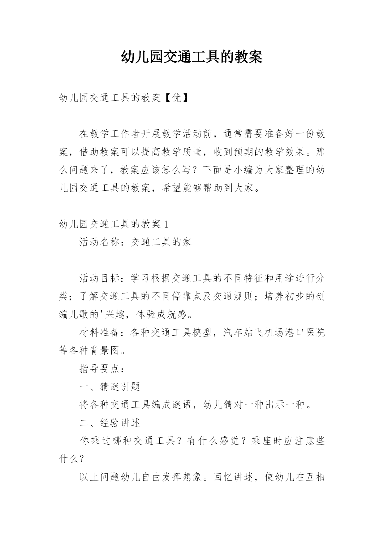 幼儿园交通工具的教案幼儿园交通工具的教案【优】在教学工作者开展教学活动前,通常需要准备好一份教案,借助教案可以提高教学质量,收到预期的教学效果。那么问题来了,教案应该怎么写?下面是小编为大家整理的幼儿园交通工具的教案,希望能够帮助到大家。幼儿园交通工具的教案1活动名称:交通工具的家活动目标:学习根据交通工具的不同特征和用途进行分类;了解交通工具的不同停靠点及交通规则;培养初步的创编儿歌的'兴趣,体验成就感。材料准备:各种交通工具模型,汽车站飞机场港口医院等各种背景图。指导要点:一、猜谜引题将各种交通工具编
