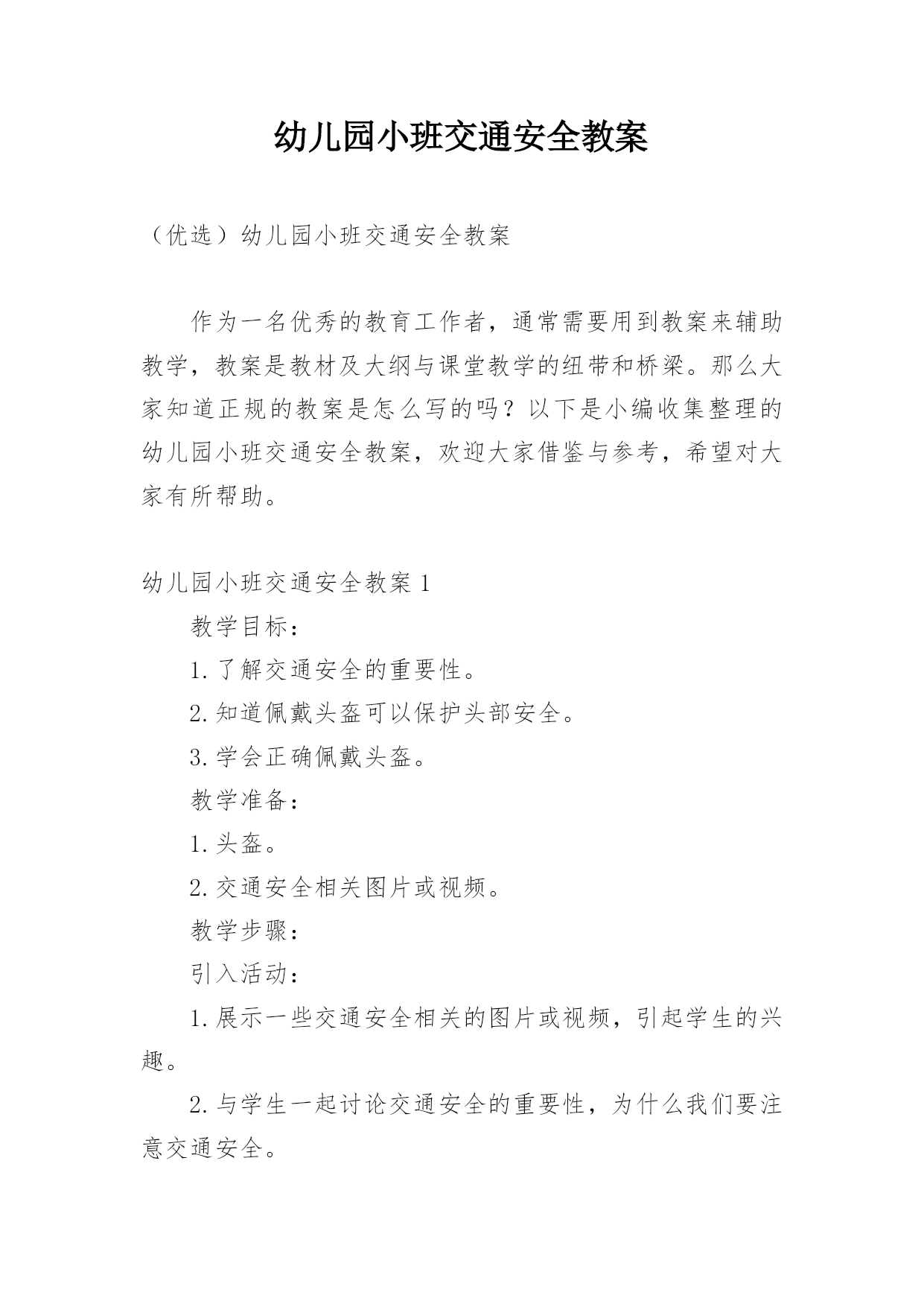 幼儿园小班交通安全教案(优选)幼儿园小班交通安全教案作为一名优秀的教育工作者,通常需要用到教案来辅助教学,教案是教材及大纲与课堂教学的纽带和桥梁。那么大家知道正规的教案是怎么写的吗?以下是小编收集整理的幼儿园小班交通安全教案,欢迎大家借鉴与参考,希望对大家有所帮助。幼儿园小班交通安全教案1教学目标:1.了解交通安全的重要性。2.知道佩戴头盔可以保护头部安全。3.学会正确佩戴头盔。教学准备:1.头盔。2.交通安全相关图片或视频。教学步骤:引入活动:1.展示一些交通安全相关的图片或视频,引起学生的兴趣。2.与