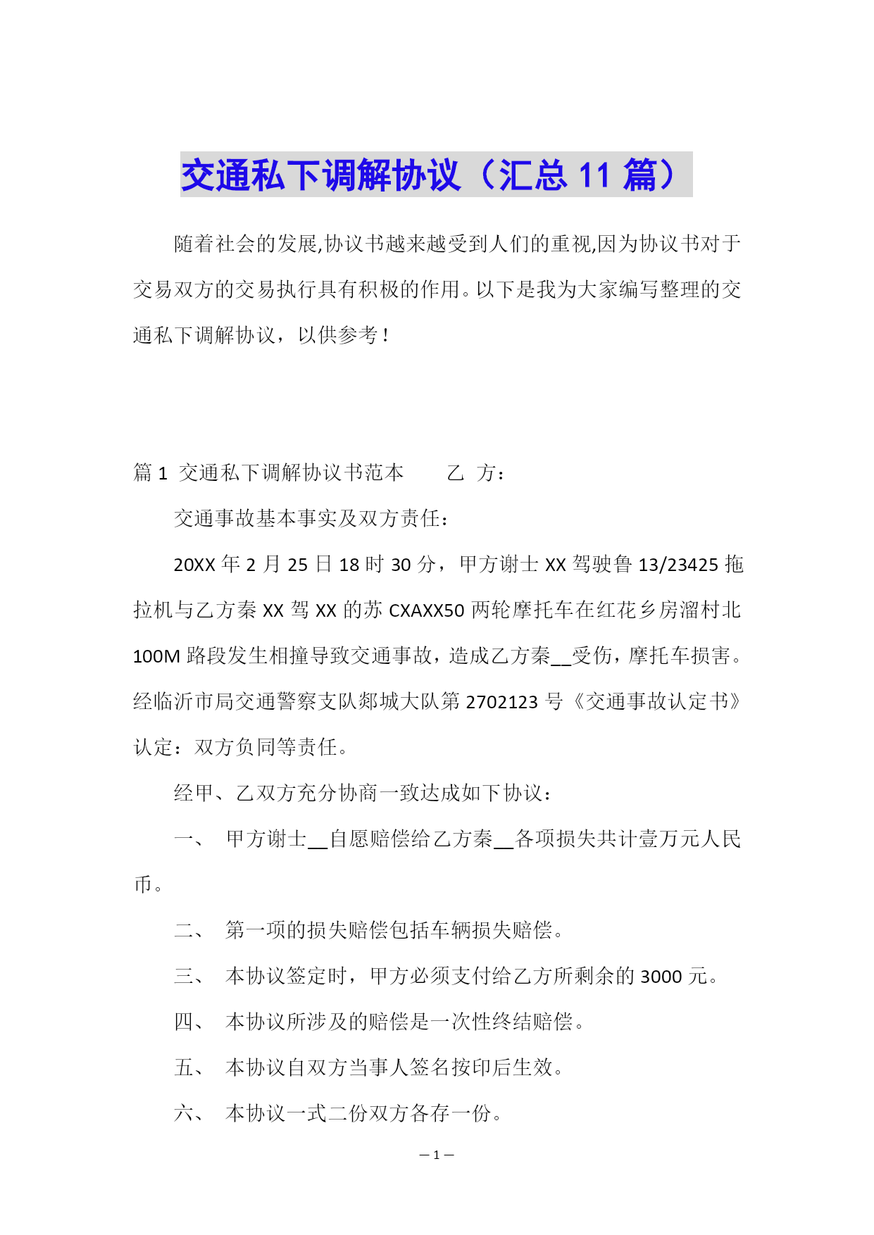 —PAGE\*MERGEFORMAT14—交通私下调解协议(汇总11篇)随着社会的发展,协议书越来越受到人们的重视,因为协议书对于交易双方的交易执行具有积极的作用。以下是我为大家编写整理的交通私下调解协议,以供参考!篇1交通私下调解协议书范本乙方:交通事故基本事实及双方责任:20XX年2月25日18时30分,甲方谢士XX驾驶鲁13/23425拖拉机与乙方秦XX驾XX的苏CXAXX50两轮摩托车在红花乡房溜村北100M路段发生相撞导致交通事故,造成乙方秦__受伤,摩托车损害。经临沂市局交通警察支队郯城