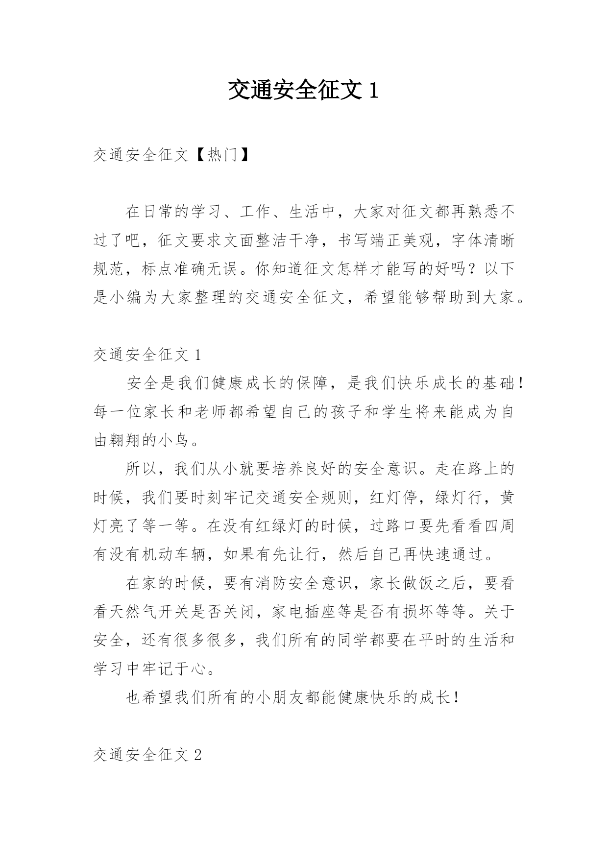 交通安全征文1交通安全征文【热门】在日常的学习、工作、生活中,大家对征文都再熟悉不过了吧,征文要求文面整洁干净,书写端正美观,字体清晰规范,标点准确无误。你知道征文怎样才能写的好吗?以下是小编为大家整理的交通安全征文,希望能够帮助到大家。交通安全征文1安全是我们健康成长的保障,是我们快乐成长的基础!每一位家长和老师都希望自己的孩子和学生将来能成为自由翱翔的小鸟。所以,我们从小就要培养良好的安全意识。走在路上的时候,我们要时刻牢记交通安全规则,红灯停,绿灯行,黄灯亮了等一等。在没有红绿灯的时候,过路口要先看