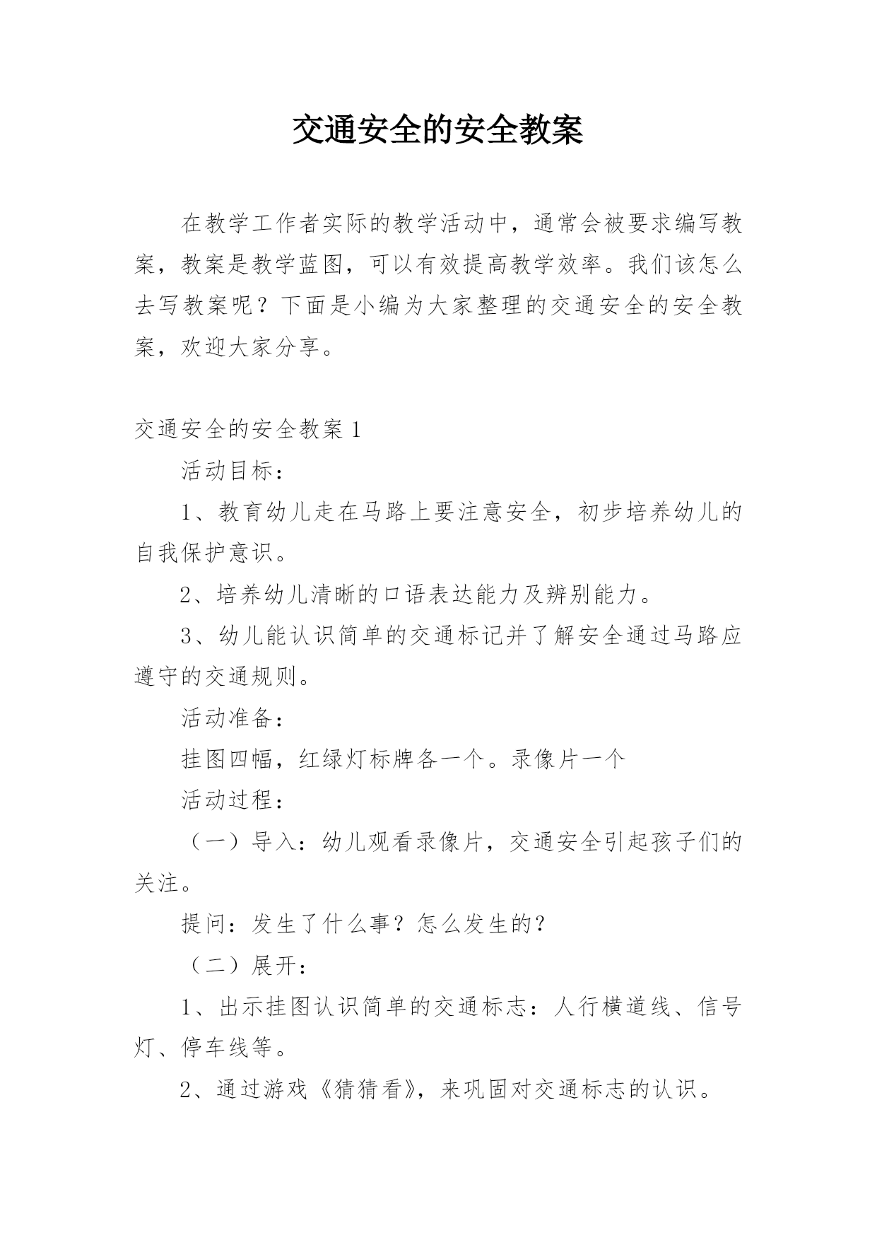 交通安全的安全教案在教学工作者实际的教学活动中,通常会被要求编写教案,教案是教学蓝图,可以有效提高教学效率。我们该怎么去写教案呢?下面是小编为大家整理的交通安全的安全教案,欢迎大家分享。交通安全的安全教案1活动目标:1、教育幼儿走在马路上要注意安全,初步培养幼儿的自我保护意识。2、培养幼儿清晰的口语表达能力及辨别能力。3、幼儿能认识简单的交通标记并了解安全通过马路应遵守的交通规则。活动准备:挂图四幅,红绿灯标牌各一个。录像片一个活动过程:(一)导入:幼儿观看录像片,交通安全引起孩子们的关注。提问:发生了什