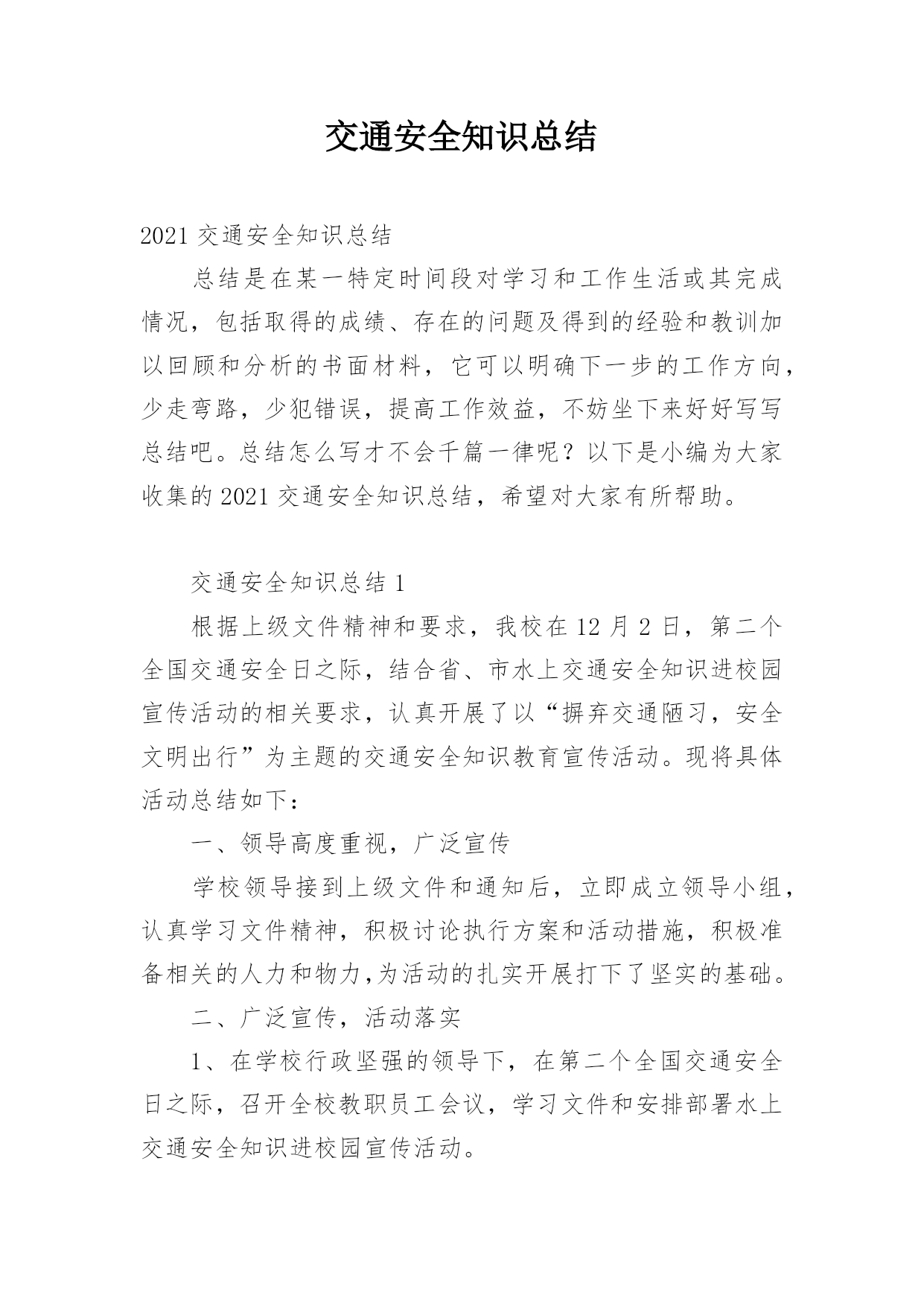 交通安全知识总结2021交通安全知识总结总结是在某一特定时间段对学习和工作生活或其完成情况,包括取得的成绩、存在的问题及得到的经验和教训加以回顾和分析的书面材料,它可以明确下一步的工作方向,少走弯路,少犯错误,提高工作效益,不妨坐下来好好写写总结吧。总结怎么写才不会千篇一律呢?以下是小编为大家收集的2021交通安全知识总结,希望对大家有所帮助。交通安全知识总结1根据上级文件精神和要求,我校在12月2日,第二个全国交通安全日之际,结合省、市水上交通安全知识进校园宣传活动的相关要求,认真开展了以“摒弃交通陋习
