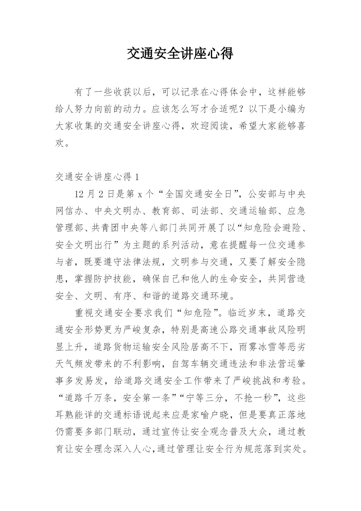 交通安全讲座心得有了一些收获以后,可以记录在心得体会中,这样能够给人努力向前的动力。应该怎么写才合适呢?以下是小编为大家收集的交通安全讲座心得,欢迎阅读,希望大家能够喜欢。交通安全讲座心得112月2日是第x个“全国交通安全日”,公安部与中央网信办、中央文明办、教育部、司法部、交通运输部、应急管理部、共青团中央等八部门共同开展了以“知危险会避险、安全文明出行”为主题的系列活动,意在提醒每一位交通参与者,既要遵守法律法规,文明参与交通,又要了解安全隐患,掌握防护技能,确保自己和他人的生命安全,共同营造安全、文