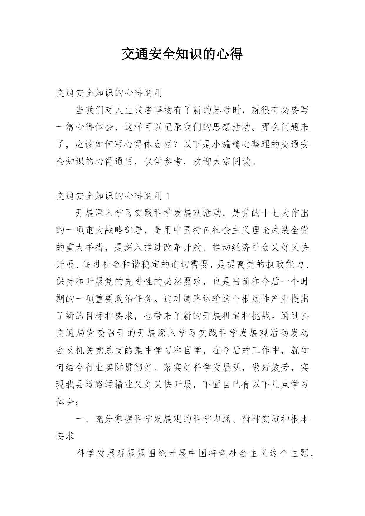交通安全知识的心得交通安全知识的心得通用当我们对人生或者事物有了新的思考时,就很有必要写一篇心得体会,这样可以记录我们的思想活动。那么问题来了,应该如何写心得体会呢?以下是小编精心整理的交通安全知识的心得通用,仅供参考,欢迎大家阅读。交通安全知识的心得通用1开展深入学习实践科学发展观活动,是党的十七大作出的一项重大战略部署,是用中国特色社会主义理论武装全党的重大举措,是深入推进改革开放、推动经济社会又好又快开展、促进社会和谐稳定的迫切需要,是提高党的执政能力、保持和开展党的先进性的必然要求,也是当前和今后