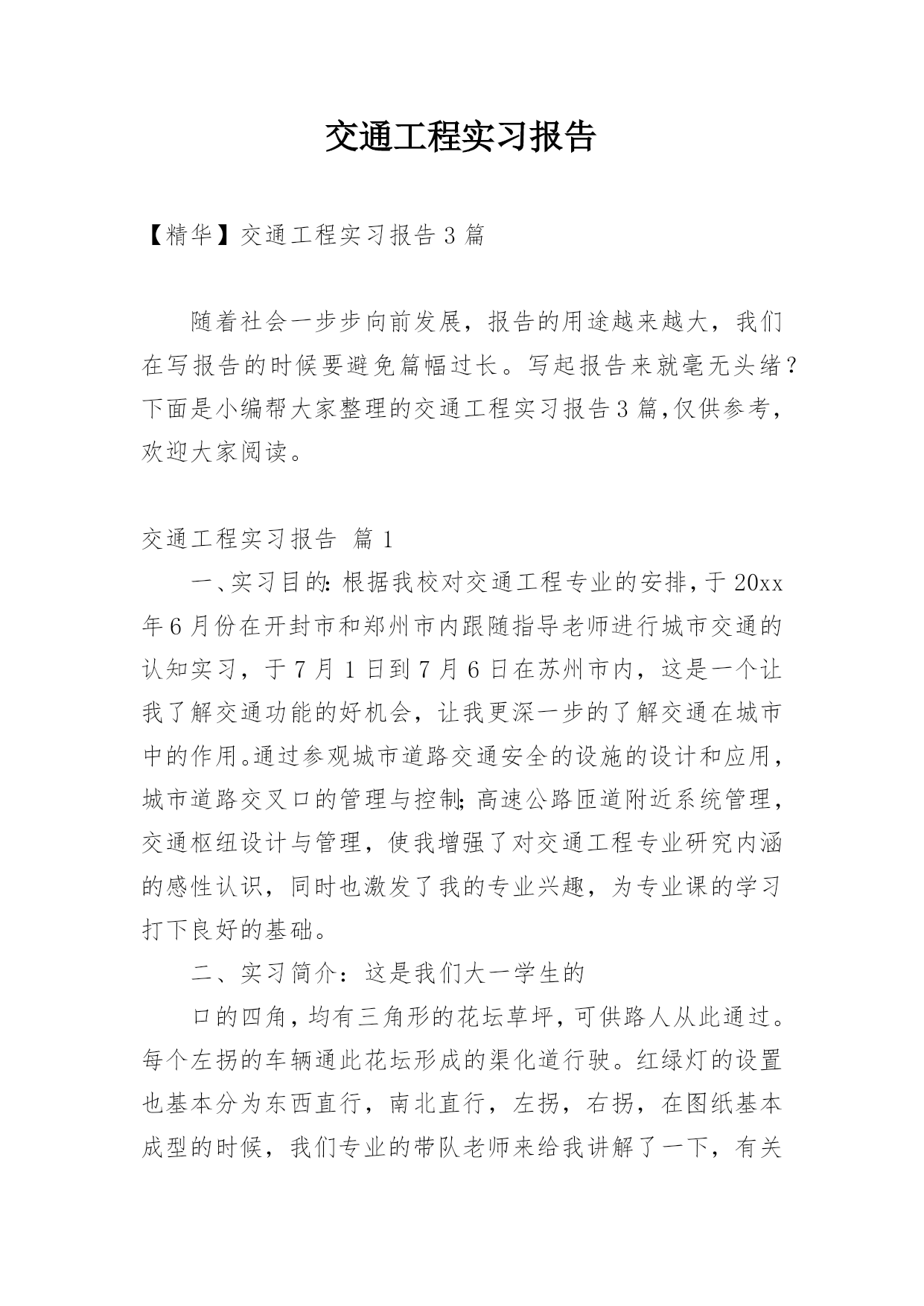 交通工程实习报告【精华】交通工程实习报告3篇随着社会一步步向前发展,报告的用途越来越大,我们在写报告的时候要避免篇幅过长。写起报告来就毫无头绪?下面是小编帮大家整理的交通工程实习报告3篇,仅供参考,欢迎大家阅读。交通工程实习报告篇1一、实习目的:根据我校对交通工程专业的安排,于20xx年6月份在开封市和郑州市内跟随指导老师进行城市交通的认知实习,于7月1日到7月6日在苏州市内,这是一个让我了解交通功能的好机会,让我更深一步的了解交通在城市中的作用。通过参观城市道路交通安全的设施的设计和应用,城市道路交叉口