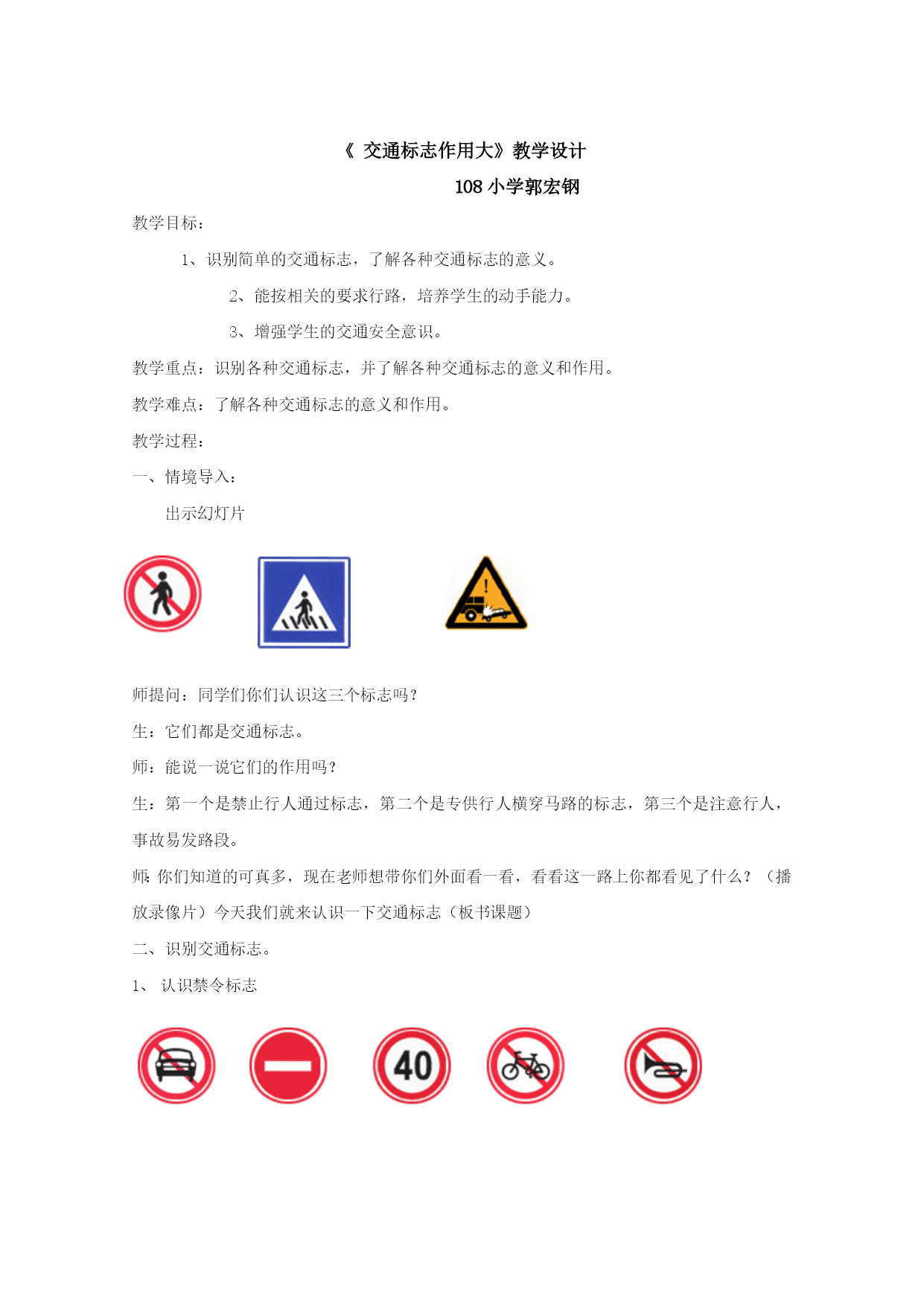 《交通标志作用大》教学设计108小学郭宏钢教学目标:1、识别简单的交通标志,了解各种交通标志的意义。2、能按相关的要求行路,培养学生的动手能力。3、增强学生的交通安全意识。教学重点:识别各种交通标志,并了解各种交通标志的意义和作用。教学难点:了解各种交通标志的意义和作用。教学过程:一、情境导入:出示幻灯片师提问:同学们你们认识这三个标志吗?生:它们都是交通标志。师:能说一说它们的作用吗?生:第一个是禁止行人通过标志,第二个是专供行人横穿马路的标志,第三个是注意行人,事故易发路段。师:你们知道的可真多,现在