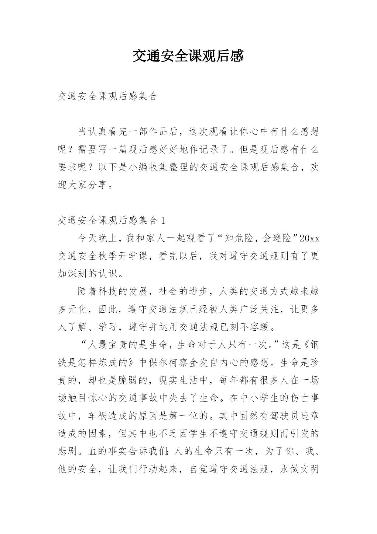交通安全课观后感交通安全课观后感集合当认真看完一部作品后,这次观看让你心中有什么感想呢?需要写一篇观后感好好地作记录了。但是观后感有什么要求呢?以下是小编收集整理的交通安全课观后感集合,欢迎大家分享。交通安全课观后感集合1今天晚上,我和家人一起观看了“知危险,会避险”20xx交通安全秋季开学课,看完以后,我对遵守交通规则有了更加深刻的认识。随着科技的发展,社会的进步,人类的交通方式越来越多元化,因此,遵守交通法规已经被人类广泛关注,让更多人了解、学习,遵守并运用交通法规已刻不容缓。“人最宝贵的是生命,生命