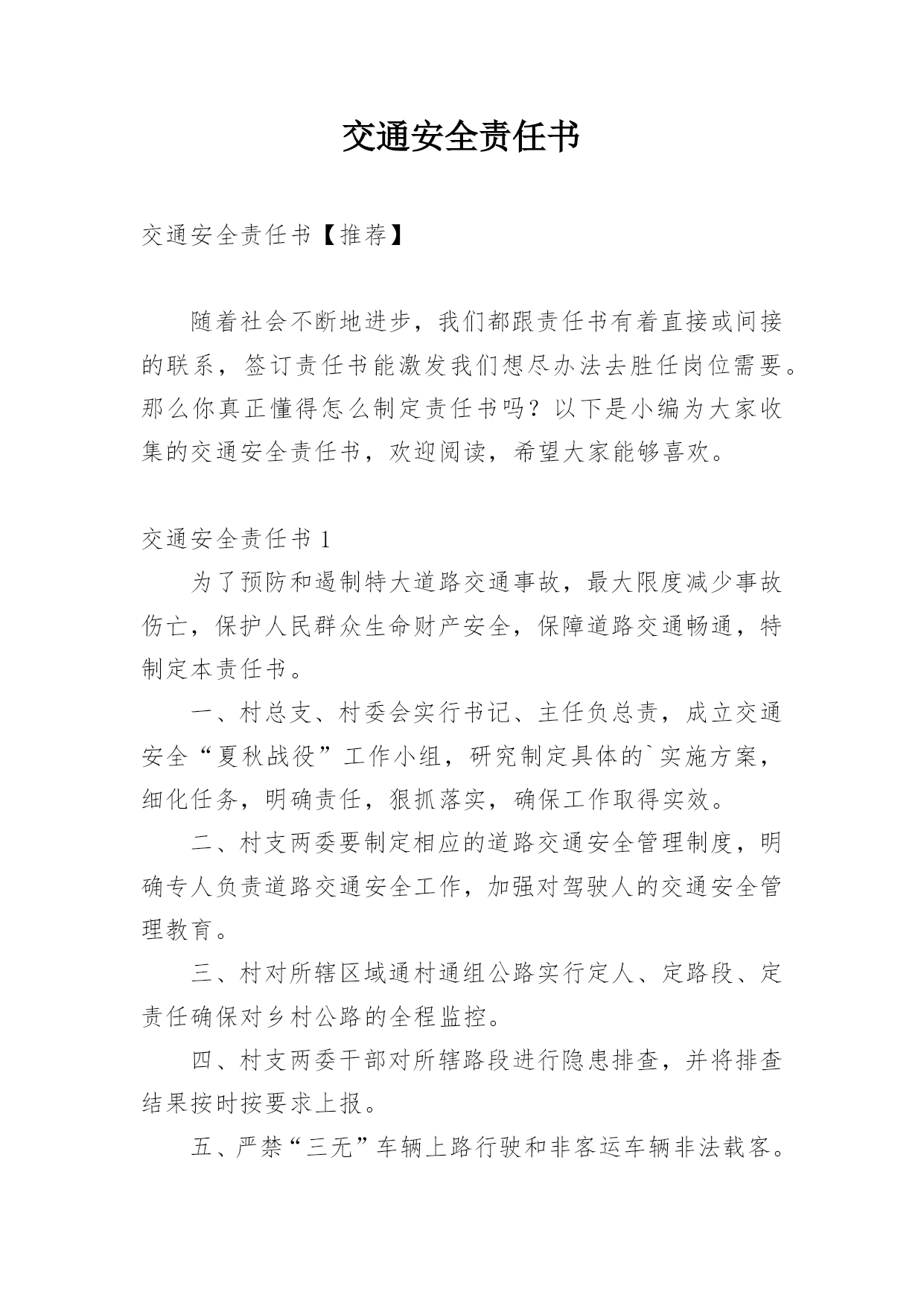 交通安全责任书交通安全责任书【推荐】随着社会不断地进步,我们都跟责任书有着直接或间接的联系,签订责任书能激发我们想尽办法去胜任岗位需要。那么你真正懂得怎么制定责任书吗?以下是小编为大家收集的交通安全责任书,欢迎阅读,希望大家能够喜欢。交通安全责任书1为了预防和遏制特大道路交通事故,最大限度减少事故伤亡,保护人民群众生命财产安全,保障道路交通畅通,特制定本责任书。一、村总支、村委会实行书记、主任负总责,成立交通安全“夏秋战役”工作小组,研究制定具体的`实施方案,细化任务,明确责任,狠抓落实,确保工作取得实效