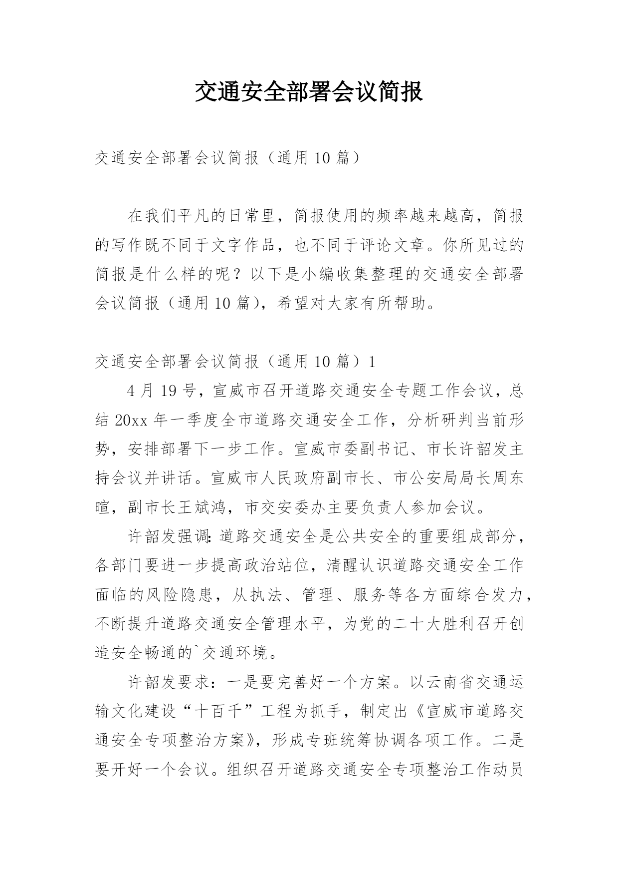 交通安全部署会议简报交通安全部署会议简报(通用10篇)在我们平凡的日常里,简报使用的频率越来越高,简报的写作既不同于文字作品,也不同于评论文章。你所见过的简报是什么样的呢?以下是小编收集整理的交通安全部署会议简报(通用10篇),希望对大家有所帮助。交通安全部署会议简报(通用10篇)14月19号,宣威市召开道路交通安全专题工作会议,总结20xx年一季度全市道路交通安全工作,分析研判当前形势,安排部署下一步工作。宣威市委副书记、市长许韶发主持会议并讲话。宣威市人民政府副市长、市公安局局长周东暄,副市长王斌鸿,