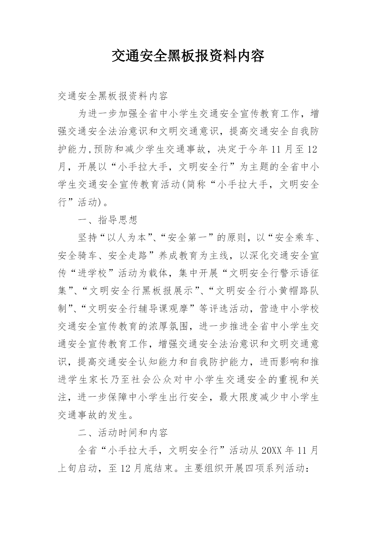 交通安全黑板报资料内容交通安全黑板报资料内容为进一步加强全省中小学生交通安全宣传教育工作,增强交通安全法治意识和文明交通意识,提高交通安全自我防护能力,预防和减少学生交通事故,决定于今年11月至12月,开展以“小手拉大手,文明安全行”为主题的全省中小学生交通安全宣传教育活动(简称“小手拉大手,文明安全行”活动)。一、指导思想坚持“以人为本”、“安全第一”的原则,以“安全乘车、安全骑车、安全走路”养成教育为主线,以深化交通安全宣传“进学校”活动为载体,集中开展“文明安全行警示语征集”、“文明安全行黑板报展示