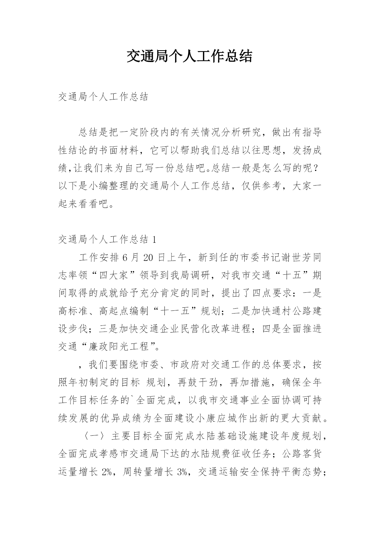 交通局个人工作总结交通局个人工作总结总结是把一定阶段内的有关情况分析研究,做出有指导性结论的书面材料,它可以帮助我们总结以往思想,发扬成绩,让我们来为自己写一份总结吧。总结一般是怎么写的呢?以下是小编整理的交通局个人工作总结,仅供参考,大家一起来看看吧。交通局个人工作总结1工作安排6月20日上午,新到任的市委书记谢世芳同志率领“四大家”领导到我局调研,对我市交通“十五”期间取得的成就给予充分肯定的同时,提出了四点要求:一是高标准、高起点编制“十一五”规划;二是加快通村公路建设步伐;三是加快交通企业民营化改