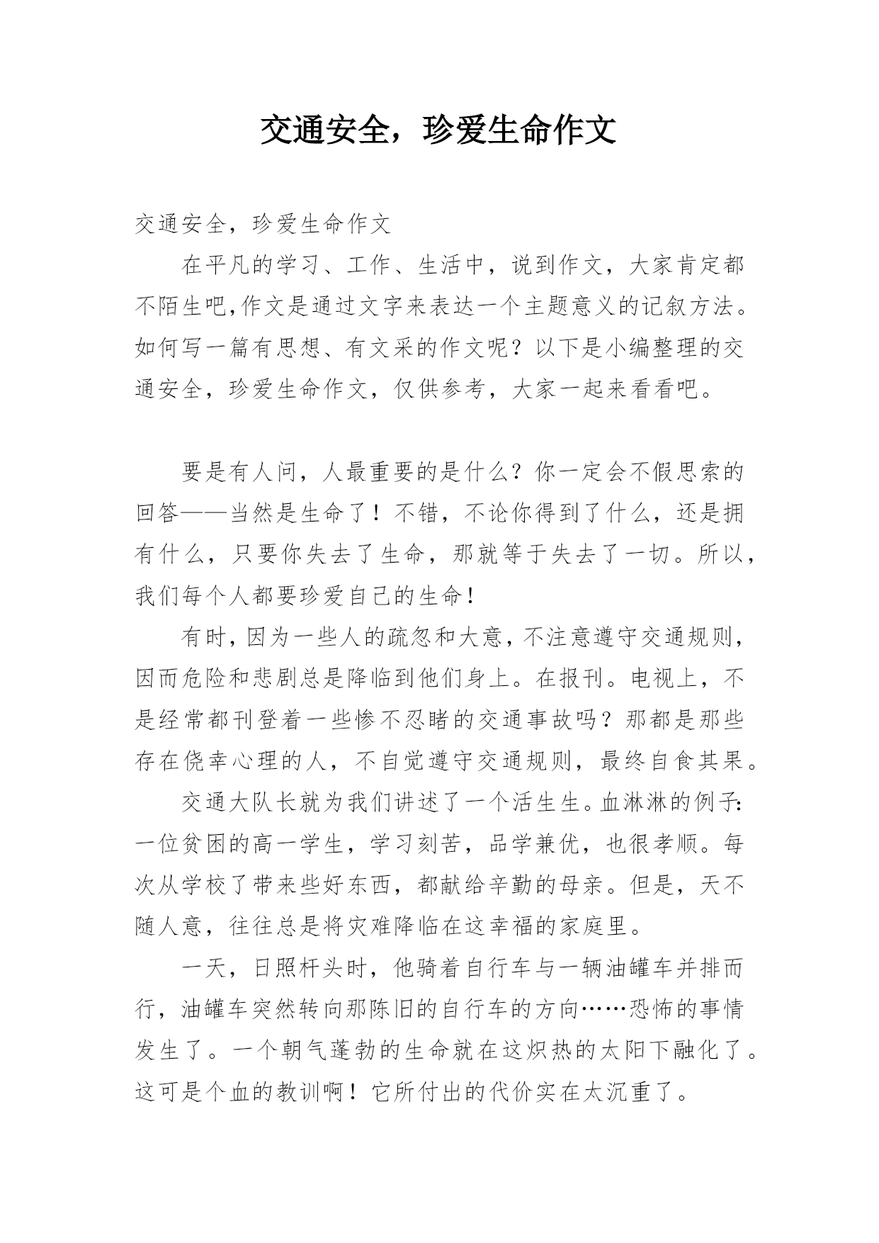 交通安全,珍爱生命作文交通安全,珍爱生命作文在平凡的学习、工作、生活中,说到作文,大家肯定都不陌生吧,作文是通过文字来表达一个主题意义的记叙方法。如何写一篇有思想、有文采的作文呢?以下是小编整理的交通安全,珍爱生命作文,仅供参考,大家一起来看看吧。要是有人问,人最重要的是什么?你一定会不假思索的回答——当然是生命了!不错,不论你得到了什么,还是拥有什么,只要你失去了生命,那就等于失去了一切。所以,我们每个人都要珍爱自己的生命!有时,因为一些人的疏忽和大意,不注意遵守交通规则,因而危险和悲剧总是降临到他们身