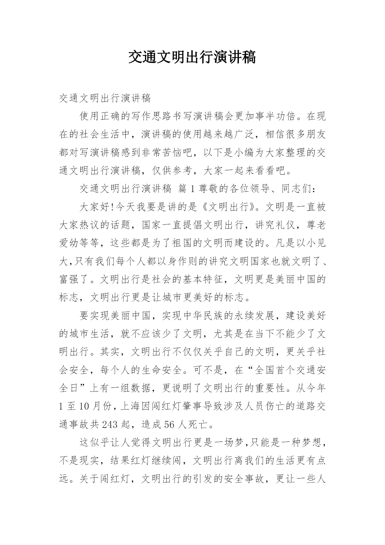 交通文明出行演讲稿交通文明出行演讲稿使用正确的写作思路书写演讲稿会更加事半功倍。在现在的社会生活中,演讲稿的使用越来越广泛,相信很多朋友都对写演讲稿感到非常苦恼吧,以下是小编为大家整理的交通文明出行演讲稿,仅供参考,大家一起来看看吧。交通文明出行演讲稿篇1尊敬的各位领导、同志们:大家好!今天我要是讲的是《文明出行》。文明是一直被大家热议的话题,国家一直提倡文明出行,讲究礼仪,尊老爱幼等等,这些都是为了祖国的文明而建设的。凡是以小见大,只有我们每个人都以身作则的讲究文明国家也就文明了、富强了。文明出行是社会