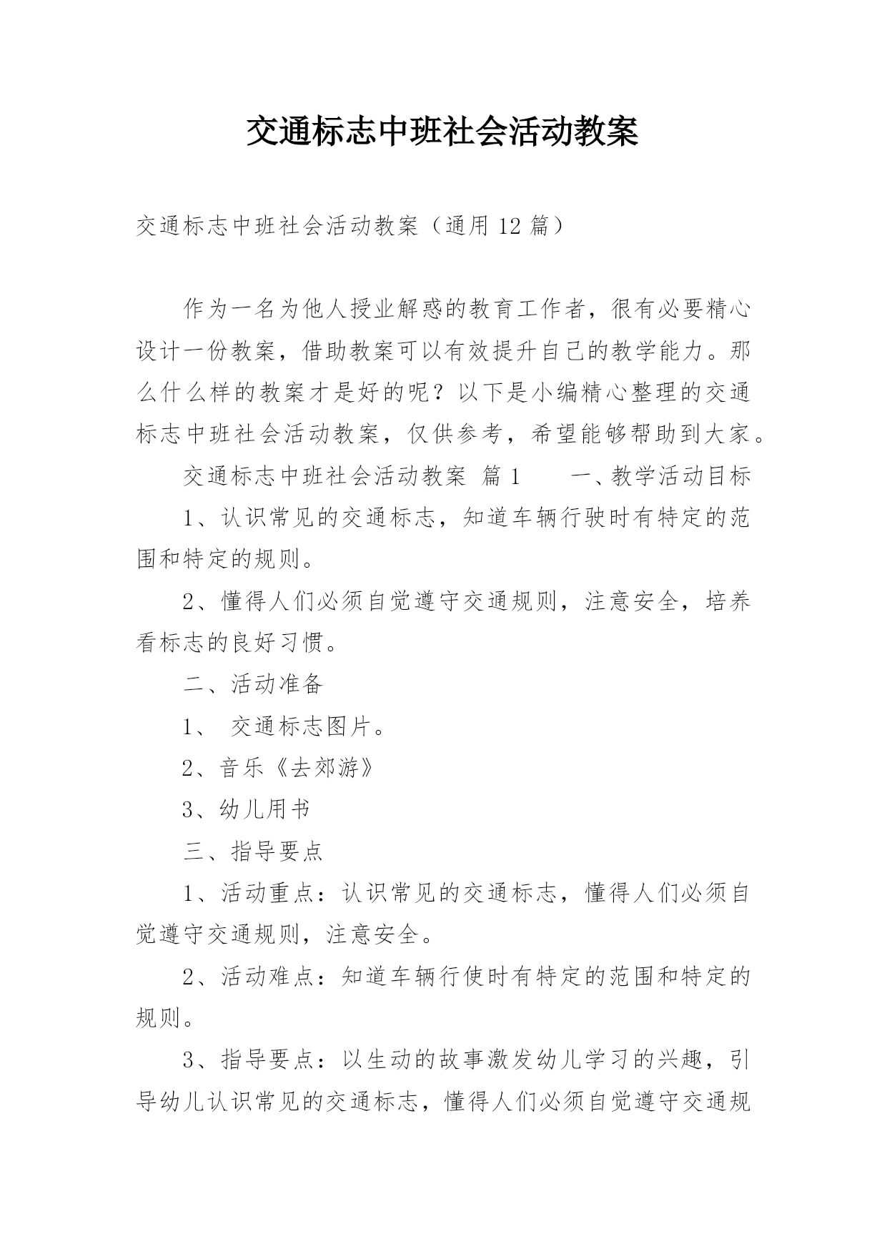 交通标志中班社会活动教案交通标志中班社会活动教案(通用12篇)作为一名为他人授业解惑的教育工作者,很有必要精心设计一份教案,借助教案可以有效提升自己的教学能力。那么什么样的教案才是好的呢?以下是小编精心整理的交通标志中班社会活动教案,仅供参考,希望能够帮助到大家。交通标志中班社会活动教案篇1一、教学活动目标1、认识常见的交通标志,知道车辆行驶时有特定的范围和特定的规则。2、懂得人们必须自觉遵守交通规则,注意安全,培养看标志的良好习惯。二、活动准备1、交通标志图片。2、音乐《去郊游》3、幼儿用书三、指导要点