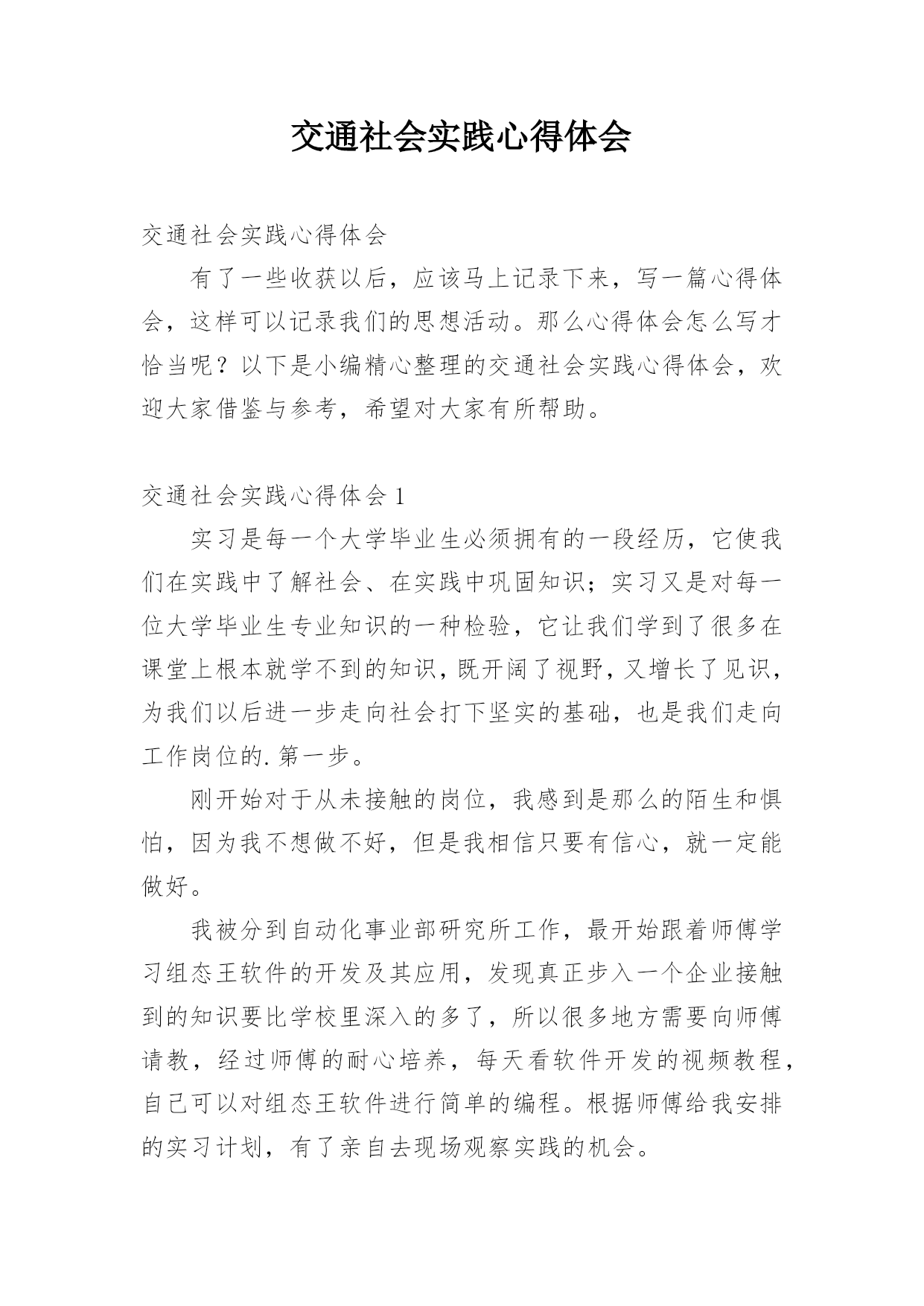 交通社会实践心得体会交通社会实践心得体会有了一些收获以后,应该马上记录下来,写一篇心得体会,这样可以记录我们的思想活动。那么心得体会怎么写才恰当呢?以下是小编精心整理的交通社会实践心得体会,欢迎大家借鉴与参考,希望对大家有所帮助。交通社会实践心得体会1实习是每一个大学毕业生必须拥有的一段经历,它使我们在实践中了解社会、在实践中巩固知识;实习又是对每一位大学毕业生专业知识的一种检验,它让我们学到了很多在课堂上根本就学不到的知识,既开阔了视野,又增长了见识,为我们以后进一步走向社会打下坚实的基础,也是我们走向