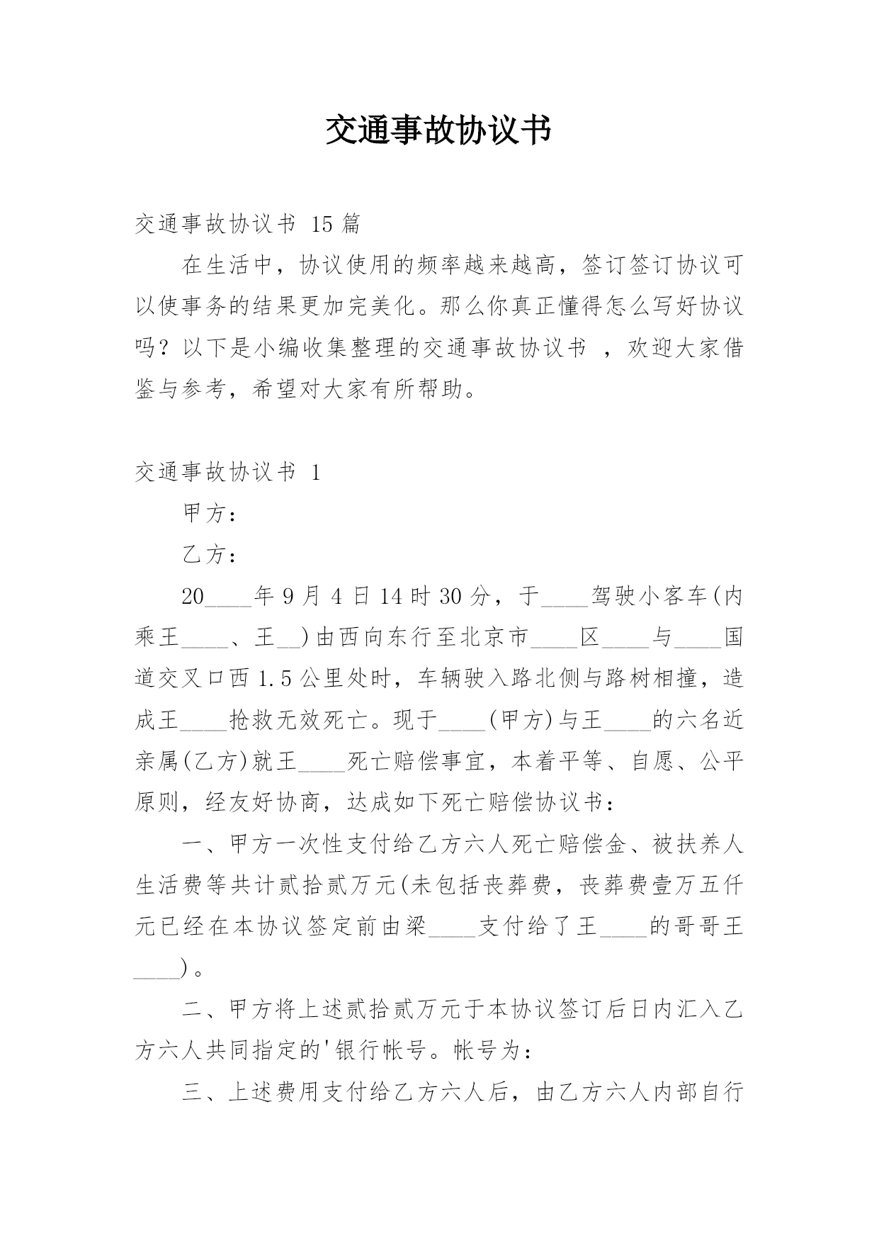 交通事故协议书交通事故协议书15篇在生活中,协议使用的频率越来越高,签订签订协议可以使事务的结果更加完美化。那么你真正懂得怎么写好协议吗?以下是小编收集整理的交通事故协议书,欢迎大家借鉴与参考,希望对大家有所帮助。交通事故协议书1甲方:乙方:20____年9月4日14时30分,于____驾驶小客车(内乘王____、王__)由西向东行至北京市____区____与____国道交叉口西1.5公里处时,车辆驶入路北侧与路树相撞,造成王____抢救无效死亡。现于____(甲方)与王____的六名近亲属(乙方)就王_