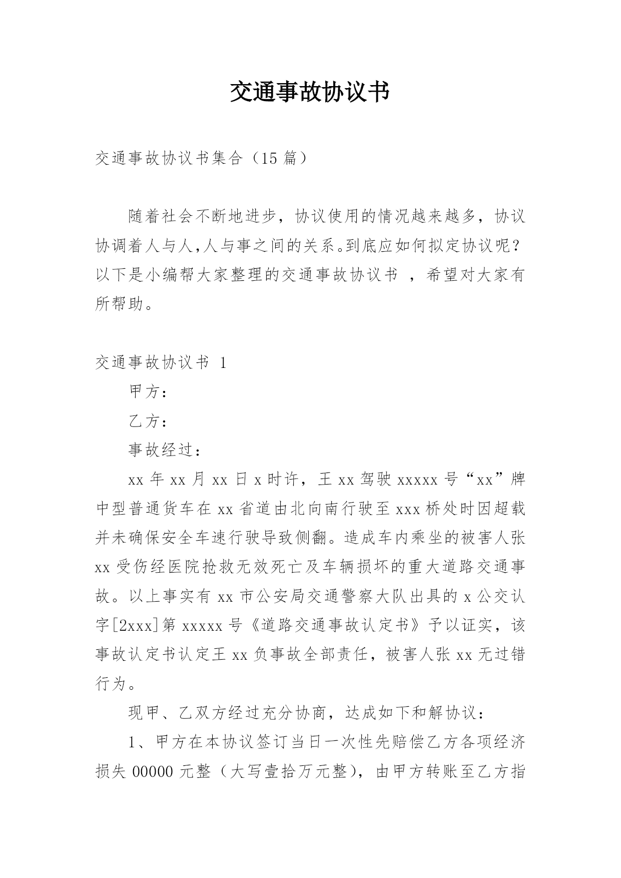 交通事故协议书交通事故协议书集合(15篇)随着社会不断地进步,协议使用的情况越来越多,协议协调着人与人,人与事之间的关系。到底应如何拟定协议呢?以下是小编帮大家整理的交通事故协议书,希望对大家有所帮助。交通事故协议书1甲方:乙方:事故经过:xx年xx月xx日x时许,王xx驾驶xxxxx号“xx”牌中型普通货车在xx省道由北向南行驶至xxx桥处时因超载并未确保安全车速行驶导致侧翻。造成车内乘坐的被害人张xx受伤经医院抢救无效死亡及车辆损坏的重大道路交通事故。以上事实有xx市公安局交通警察大队出具的x公交认字